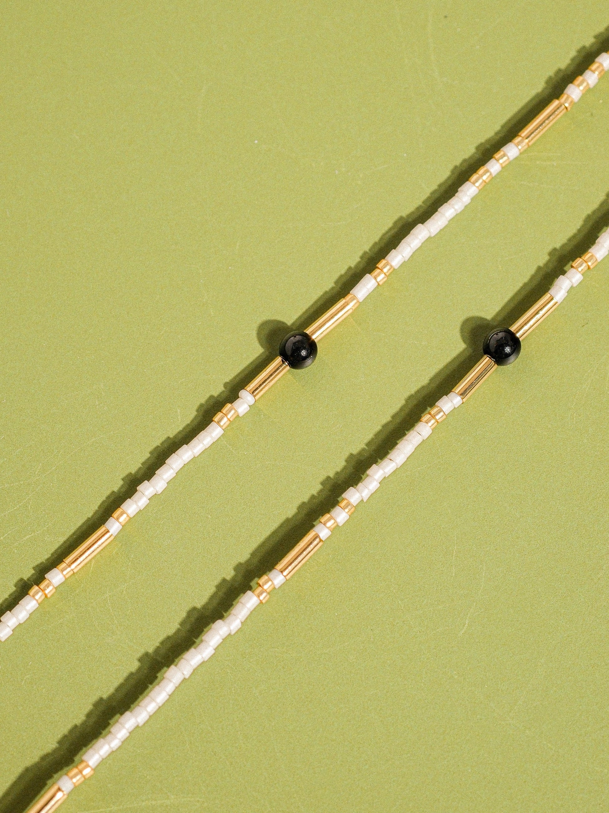 Nyx 18K Gold-Plated White and Black Beaded Necklace Colored beads in white, Black, and Gold Handmade Brass Chain Length (inch): 15 Extension Length (inch): 2