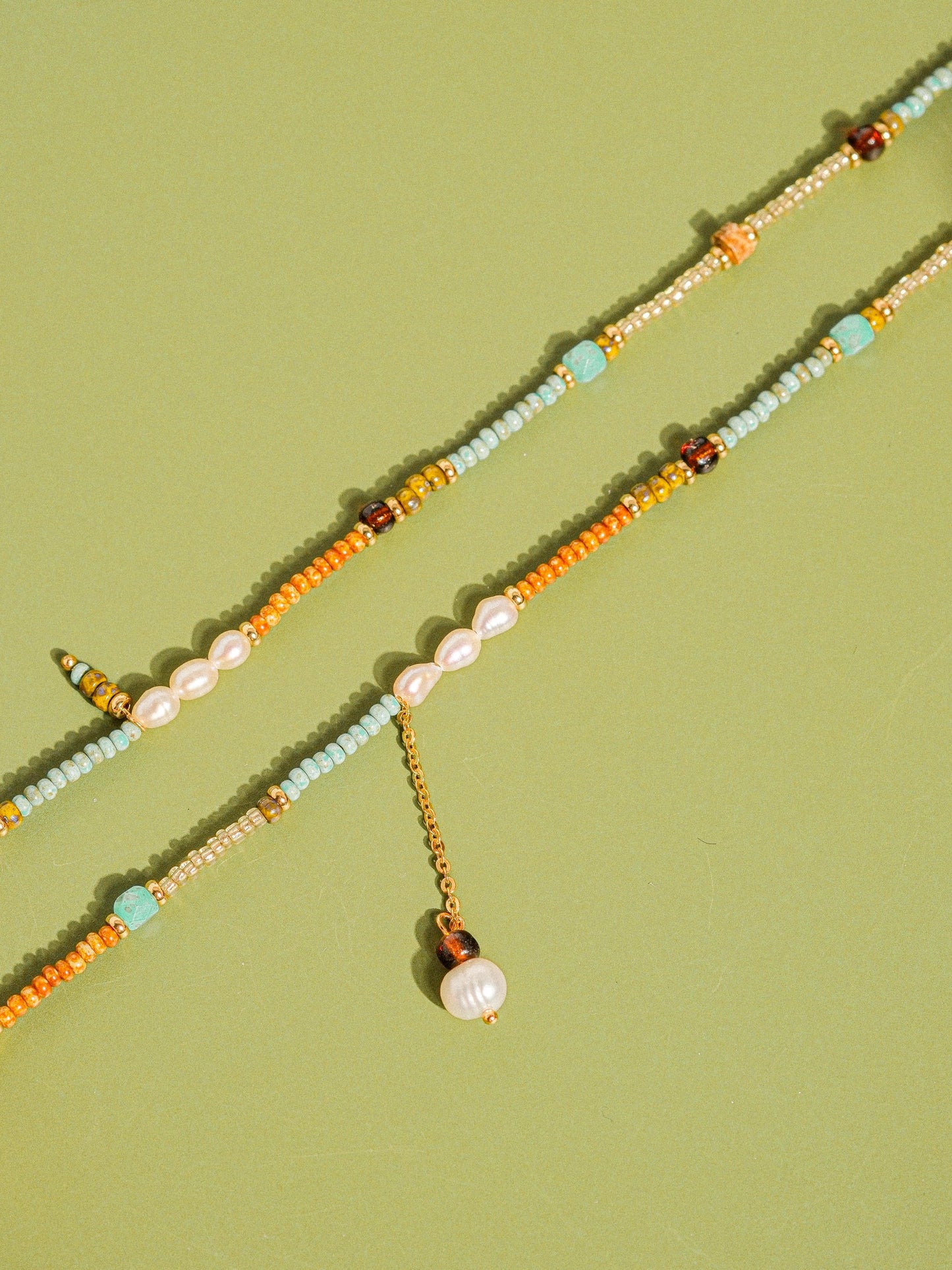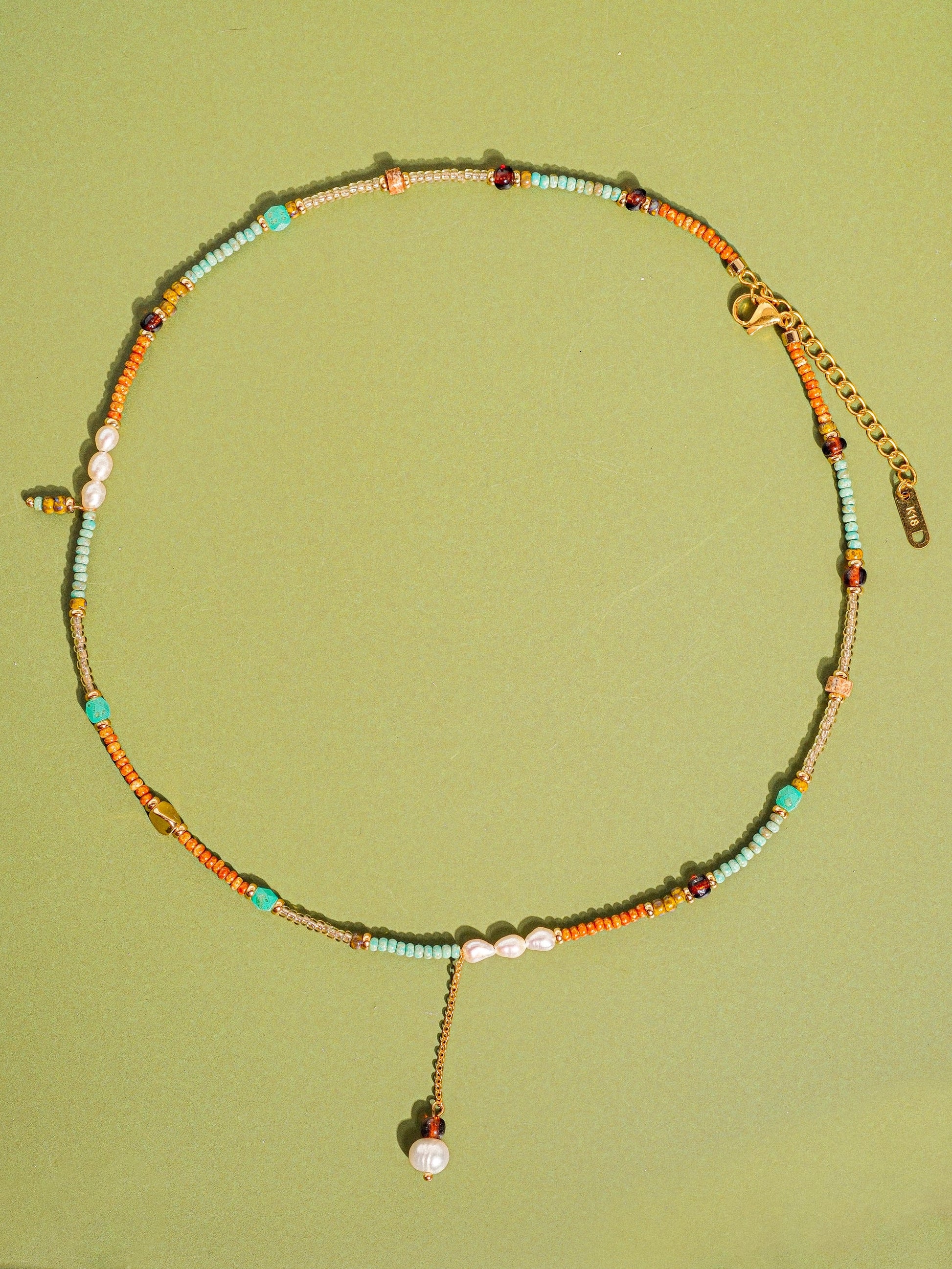 Sapphira 18K Gold-Plated Bohemian Turquoise Beaded Necklace Colored beads in Turquoise and Brown Natural Pearl Handmade Brass Pendant Size (inch): 1.2 long + 0.25 Pearl diameter Chain Length (inch): 16 Extension Length (inch): 2