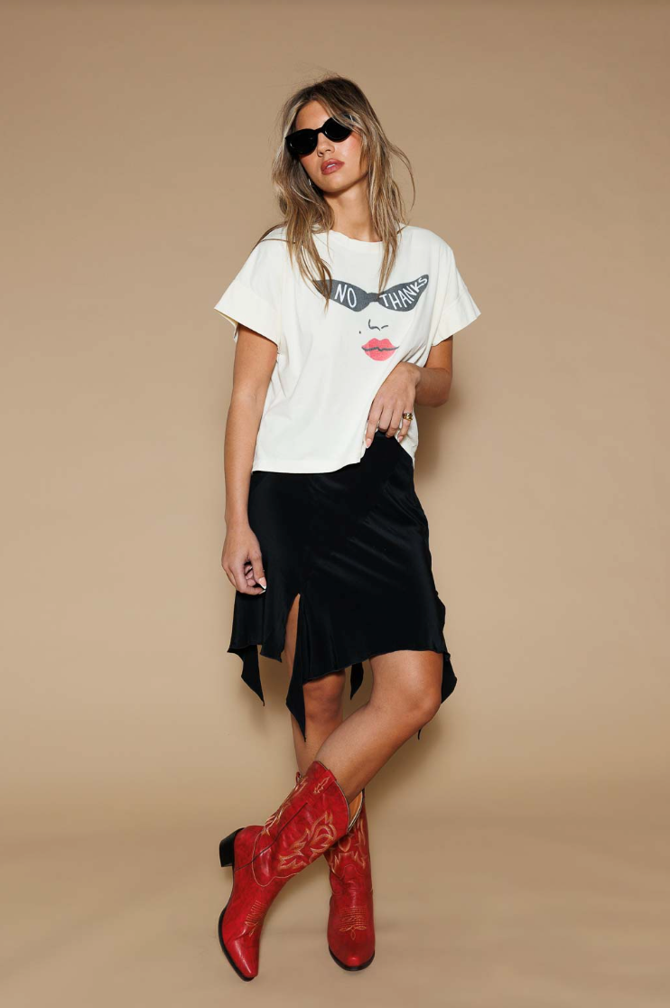 Embrace your independent spirit with the All Us 'No Thanks' Hi-Lo Tee, a spirited declaration crafted from the softest, creamy cotton. This relaxed, free-flowing silhouette, featuring playful cuffed sleeves and a captivating graphic, invites a quiet confidence into your everyday. Perfect for collecting moments of creative independence or navigating the city pulse, it drapes beautifully for an effortlessly chic statement that resonates with vintage bohemia.