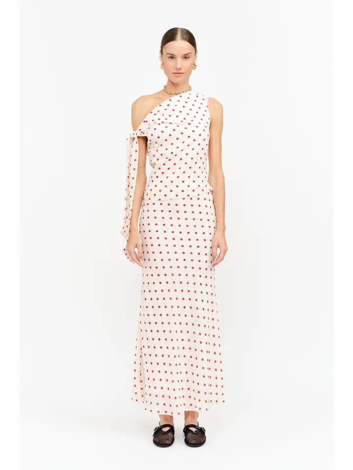 Embrace a whisper of whimsical elegance with the Celestine Dot Top, a beautifully draped one-shoulder design adorned with charming scarlet polka dots. Crafted from a fluid, feather-light fabric, its graceful silhouette features a delicate tie detail that cascades, celebrating your individual spirit and every movement. Perfect for collecting sun-drenched moments or weaving new memories under starlit skies, this piece effortlessly bridges artisan charm with modern sophistication, inviting you to create your own style narrative.