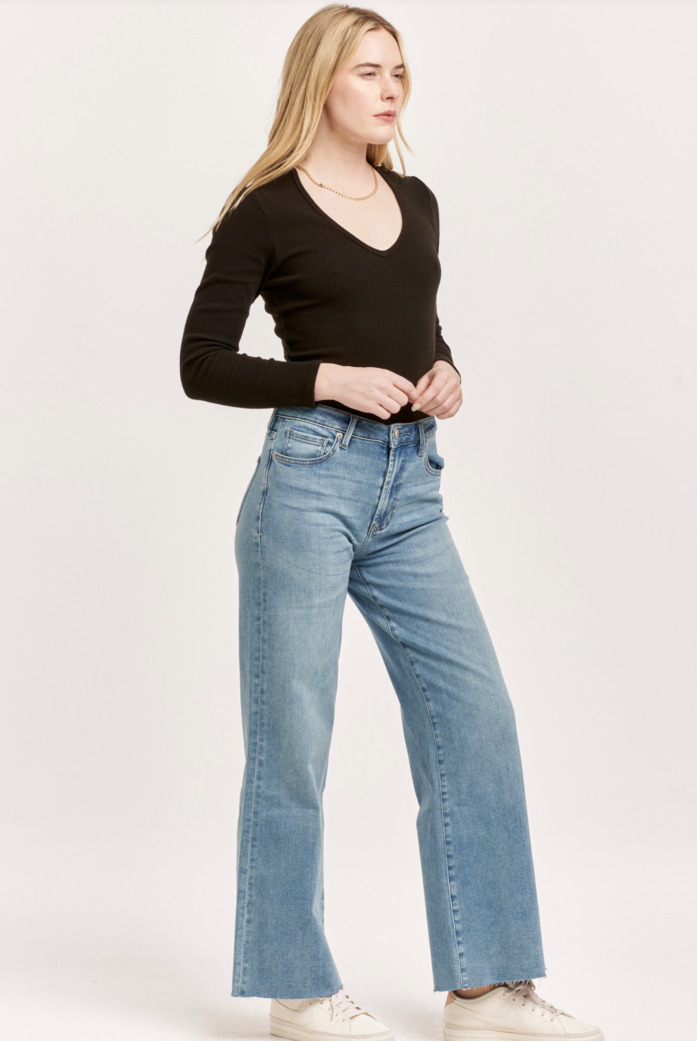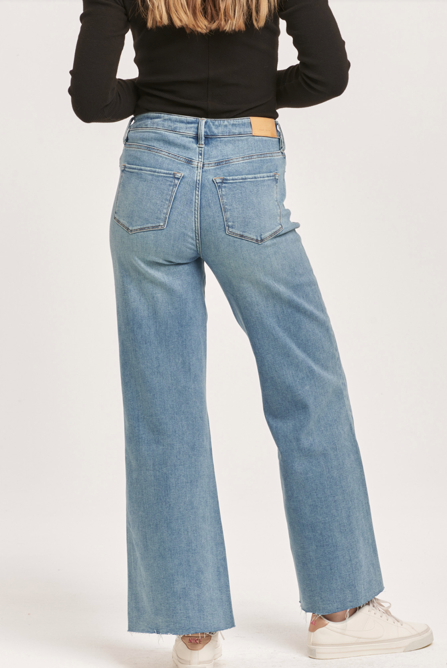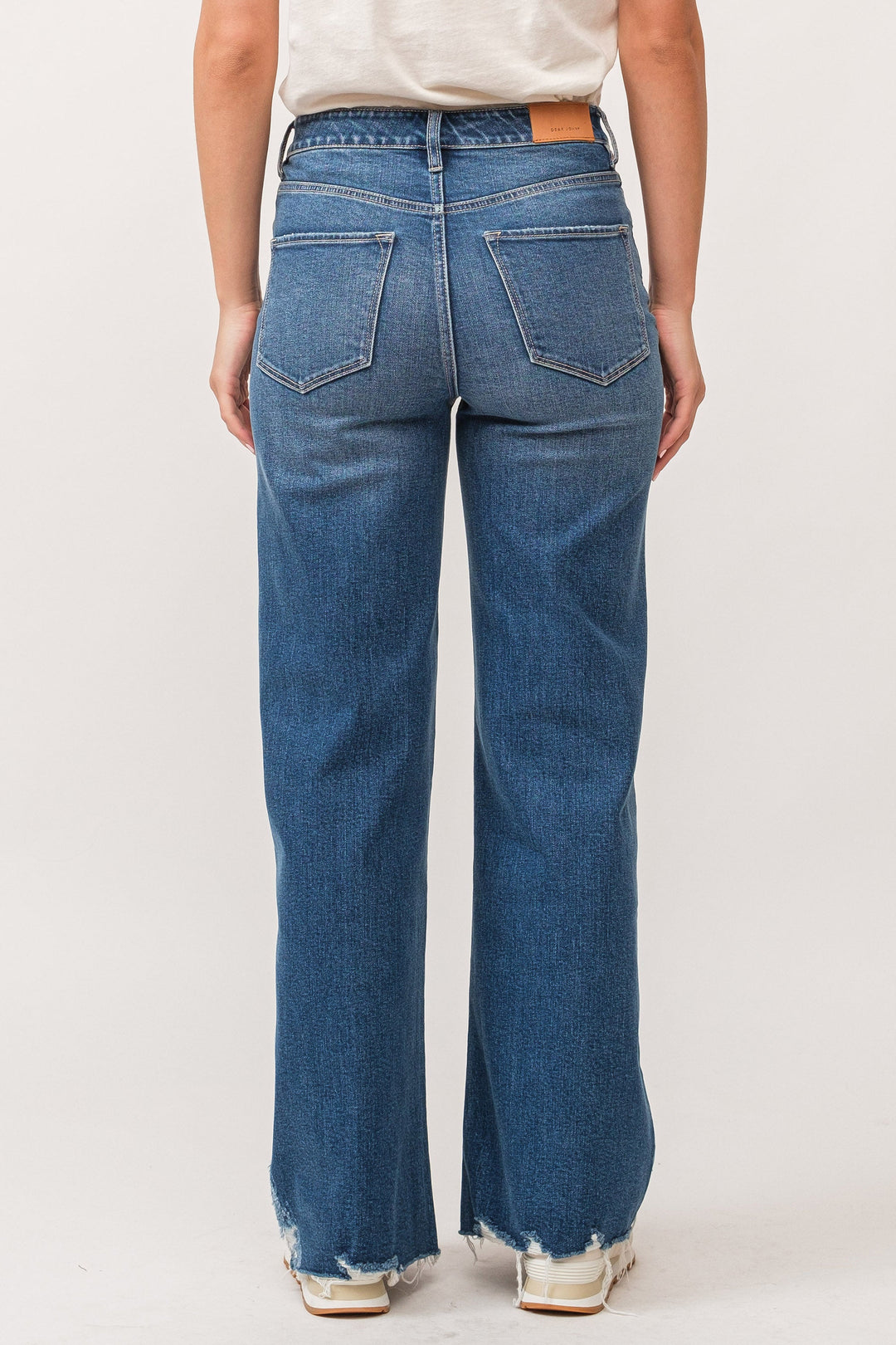 High rise wide leg jeans. It's cozy fit that sits at natural waist, embraces your natural curves and accentuates your hips and thigh. Full inseam on comfort stretch denim accented with hand sanding hip whiskers, tailor pressed seam lines, pocket grinding, sideseam destructions, cut-off hem & frayed details.