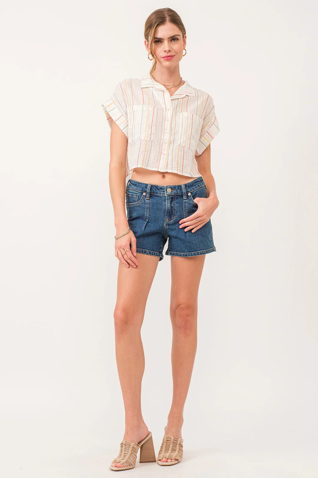 Classic denim mid rise shorts. The real deal fit, casually lounging a touch lower on the waist while embracing your curves from hip to thigh. These shorts, made from comfort stretch denim, boast an inseam and front pleats for added style and flair.