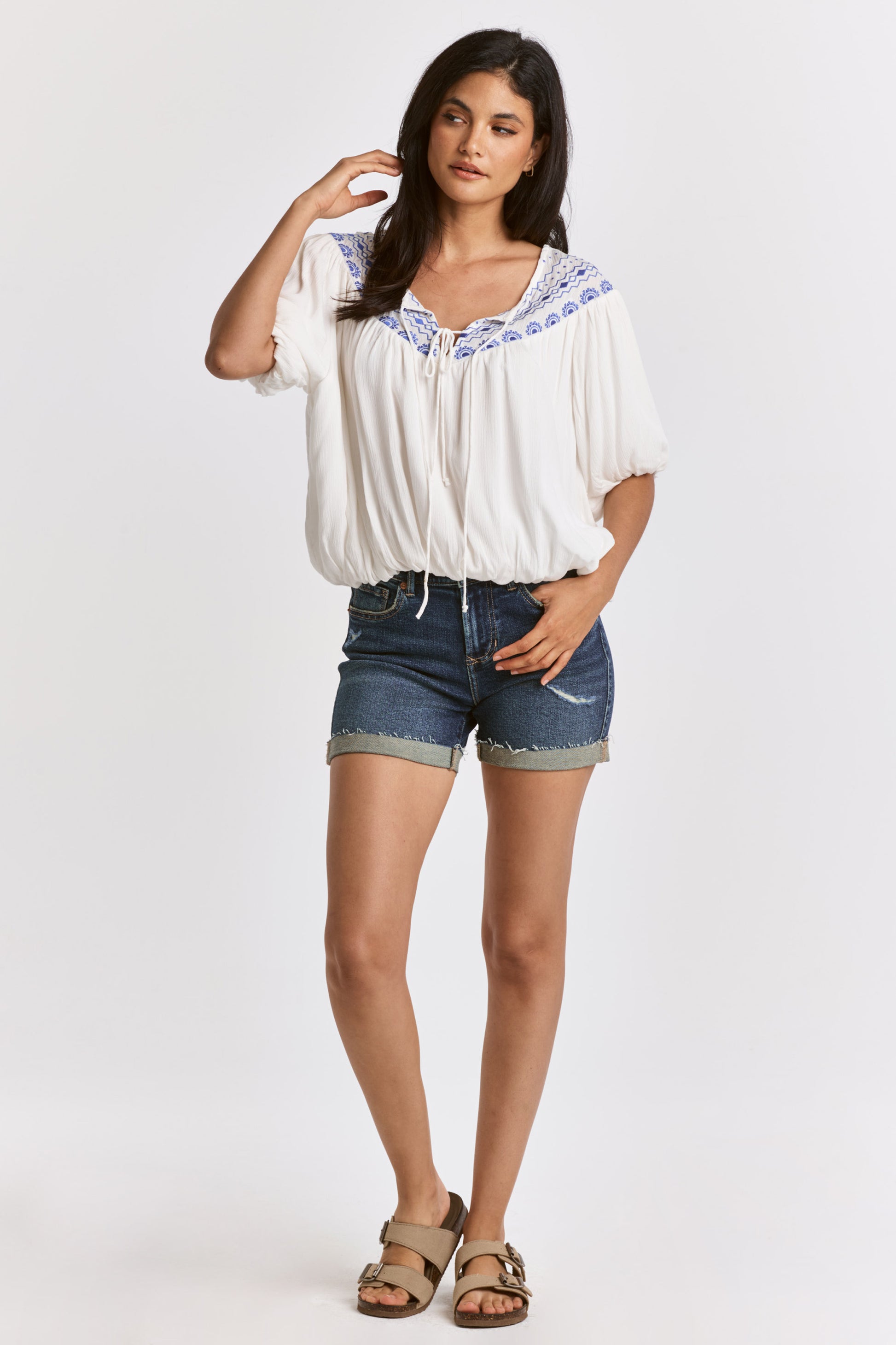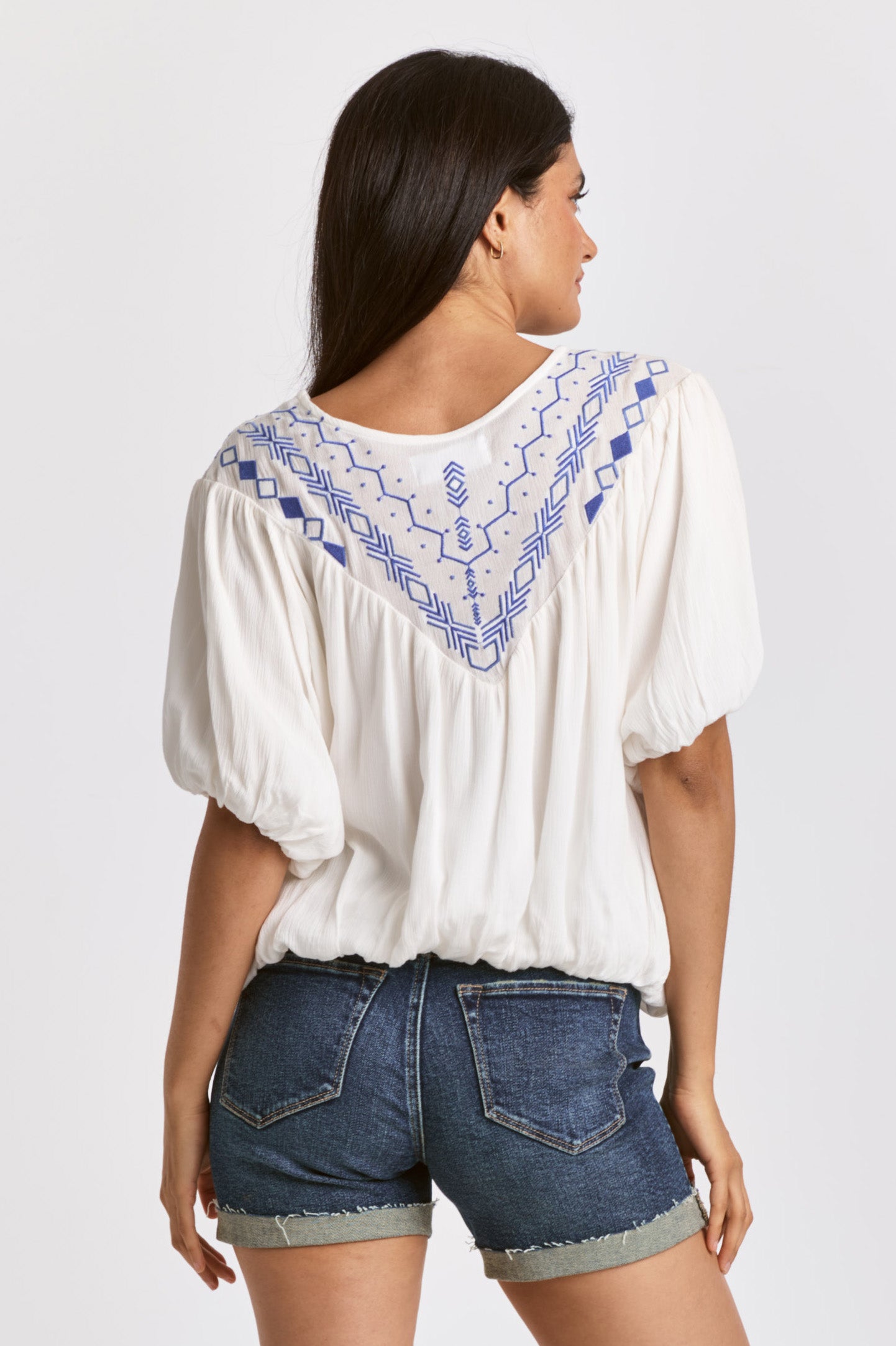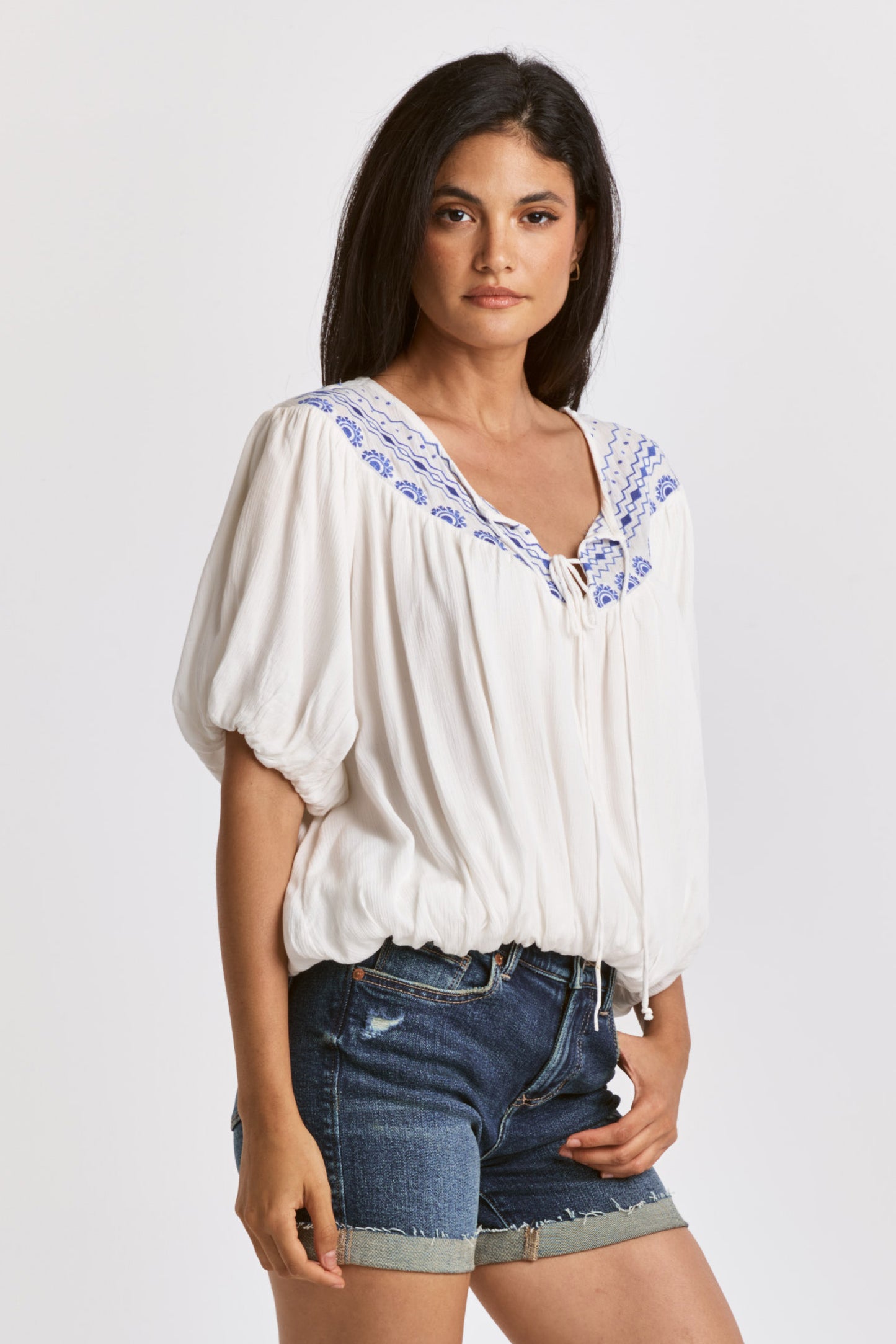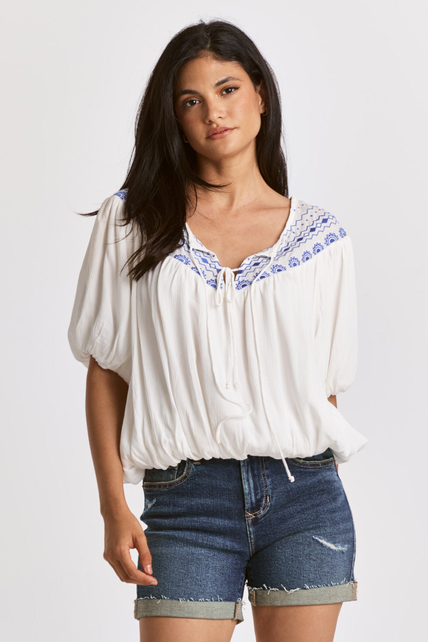 Embroidery insert top at front & back yoke, v-neck keyhole with self-ties, raglan sleeve & sweep finish with elastic band. Solid color woven on relaxed fit. Tapestry of grace through your interpretation to capture the precision in style refinement.