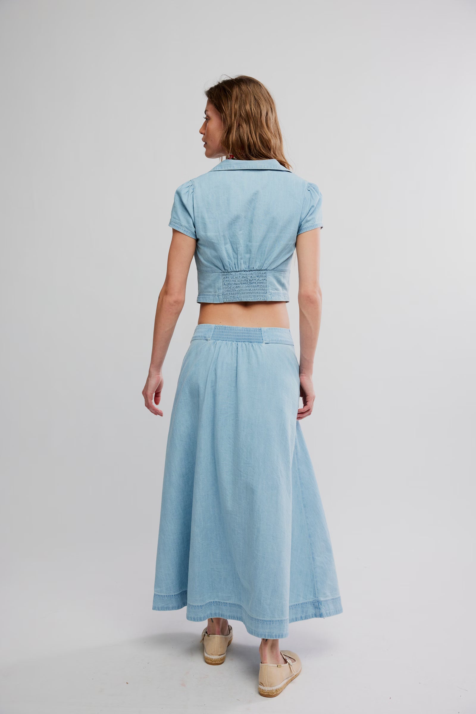 Evoking the soulful spirit of a sun-drenched studio, this ethereal light-wash denim set perfectly blends vintage bohemia with the effortless pulse of modern creative independence. The cropped, button-front bodice features a feminine collared neckline and delicate ruching, paired beautifully with a flowing maxi skirt that moves with nostalgic grace and the functional ease of deep side pockets. Crafted for a life of collecting moments like pressed petals, this breathable ensemble offers a seamless transition from morning reverie in the garden to the golden glow of an evening city stroll. It is a premium, heirloom-inspired staple designed for the artisan heart, ensuring you feel both grounded and inspired in every authentic movement.