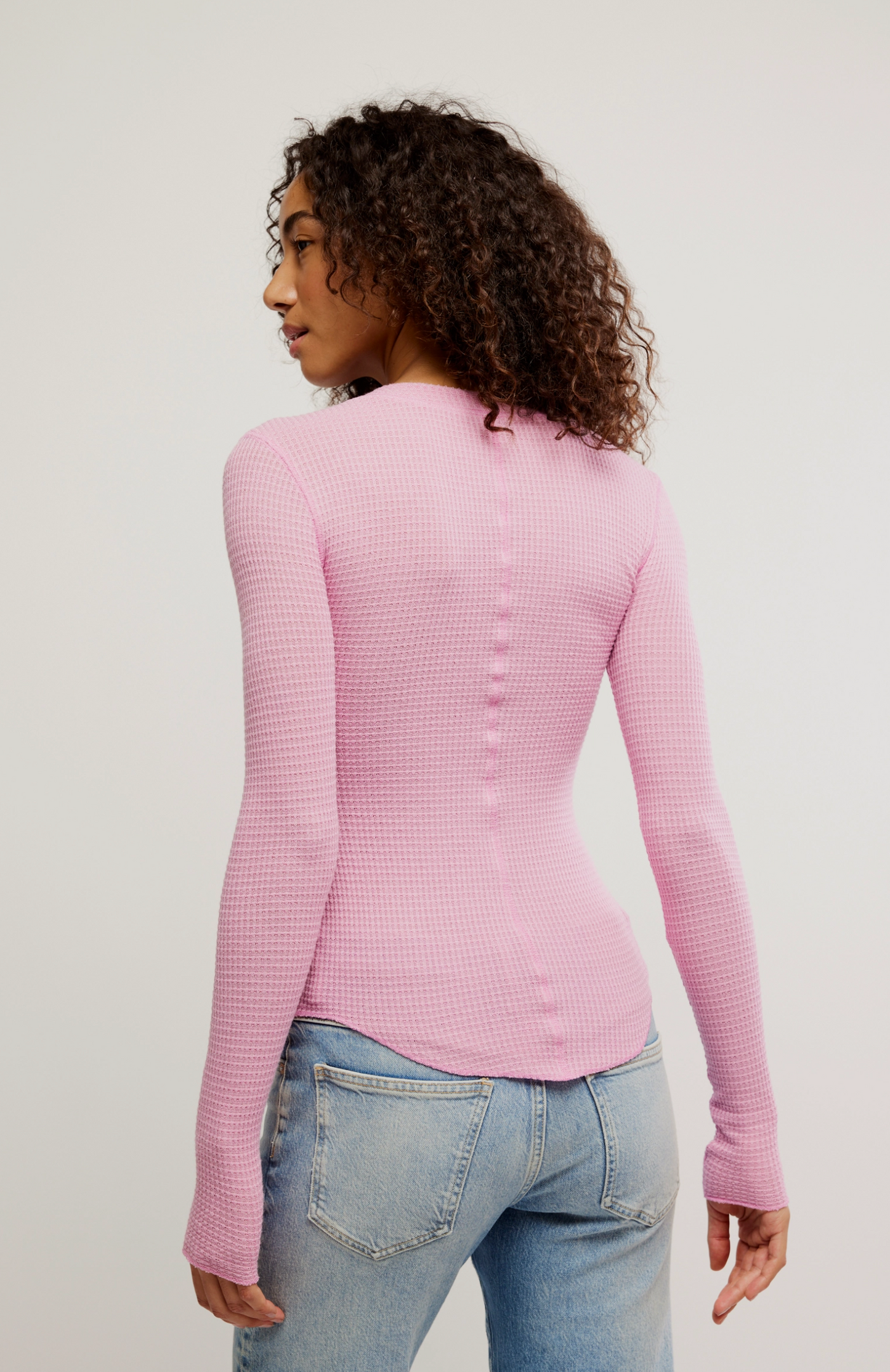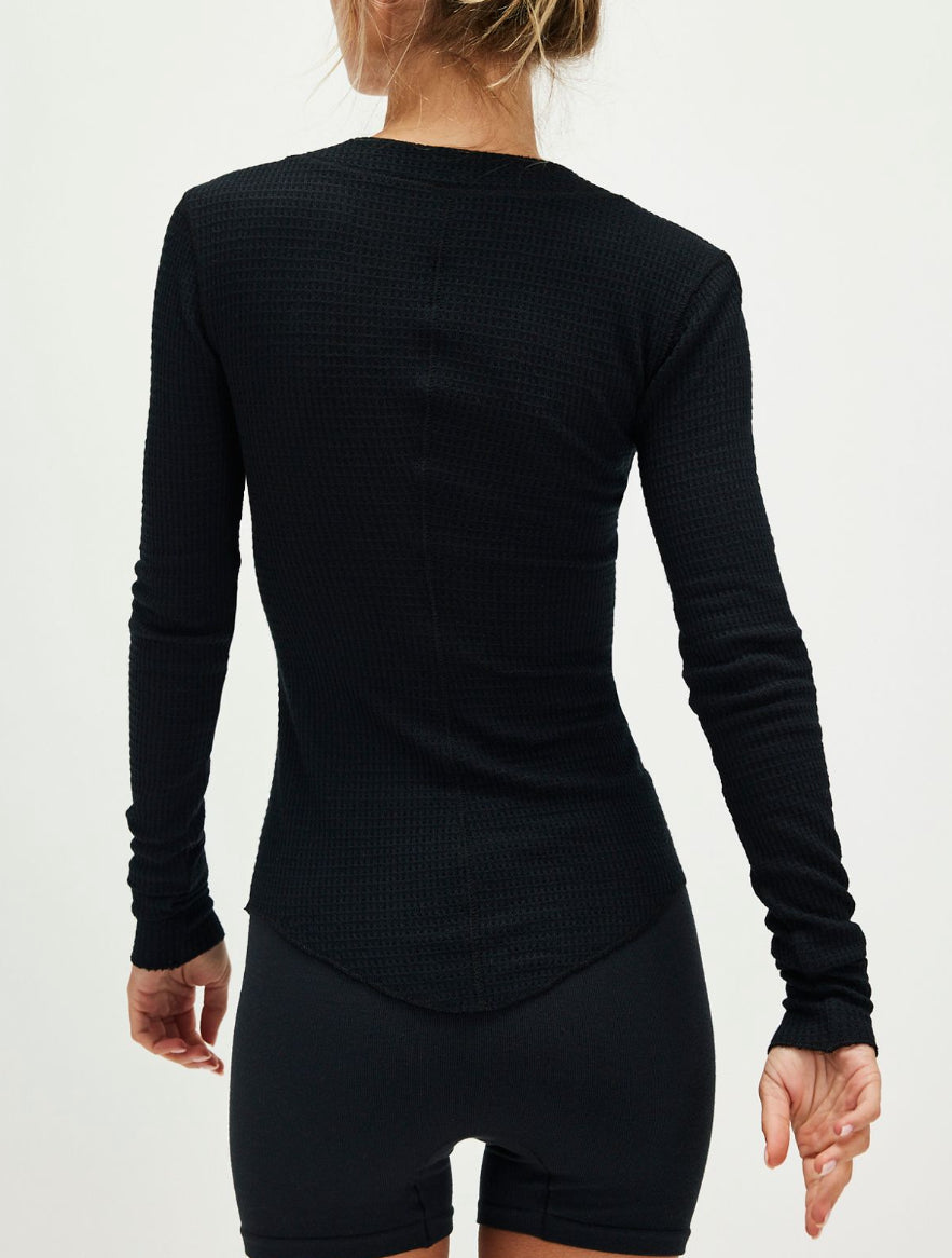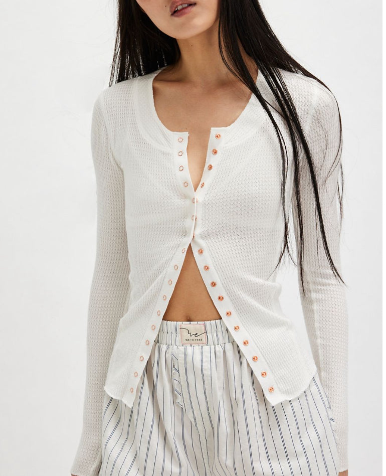 Features: Button-front closure, waffle knit fabrication