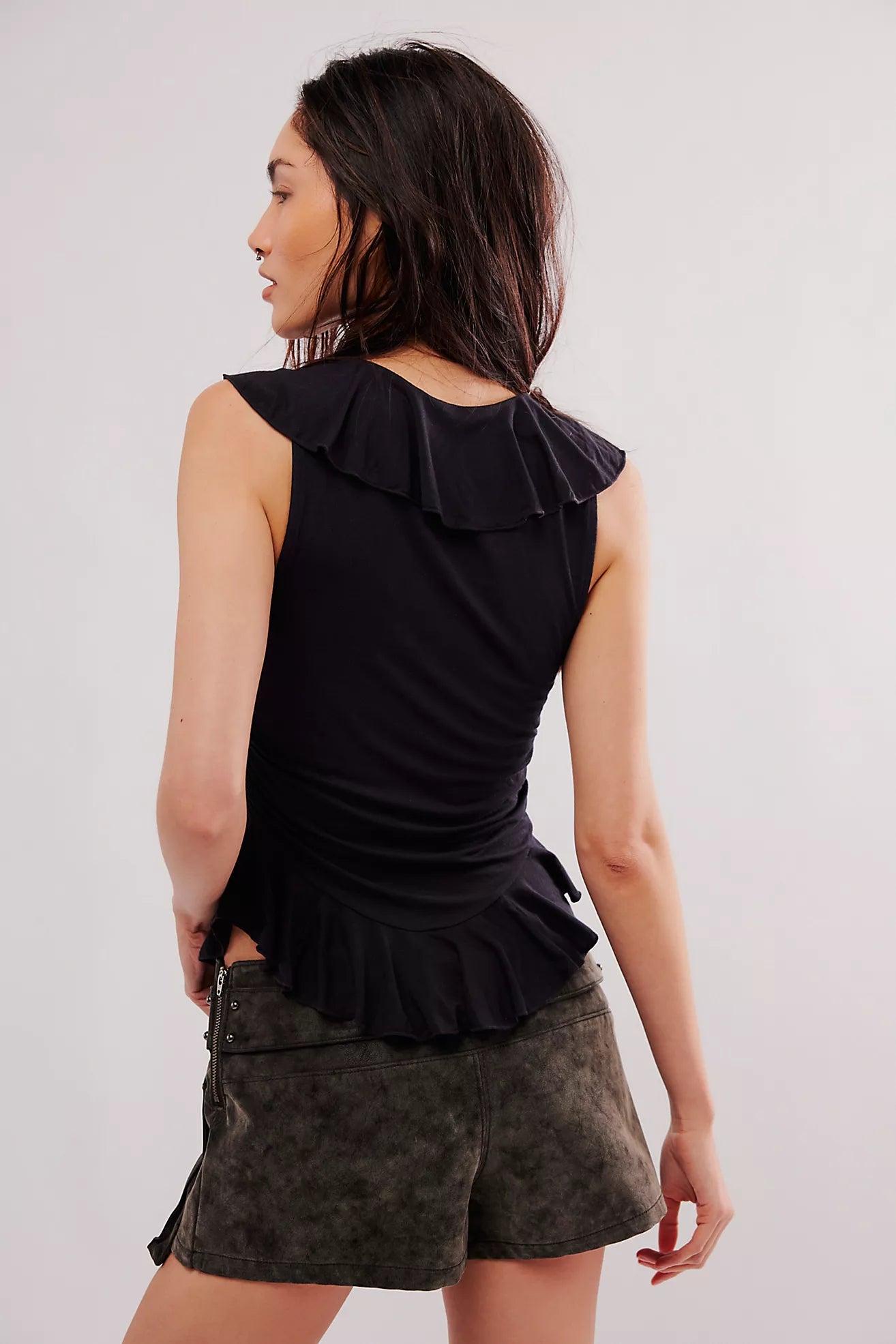 So femme and flattering, this tank is featured in a slim-fitting silhouette and soft fabrication with ruffled trim and a deep V-neckline.