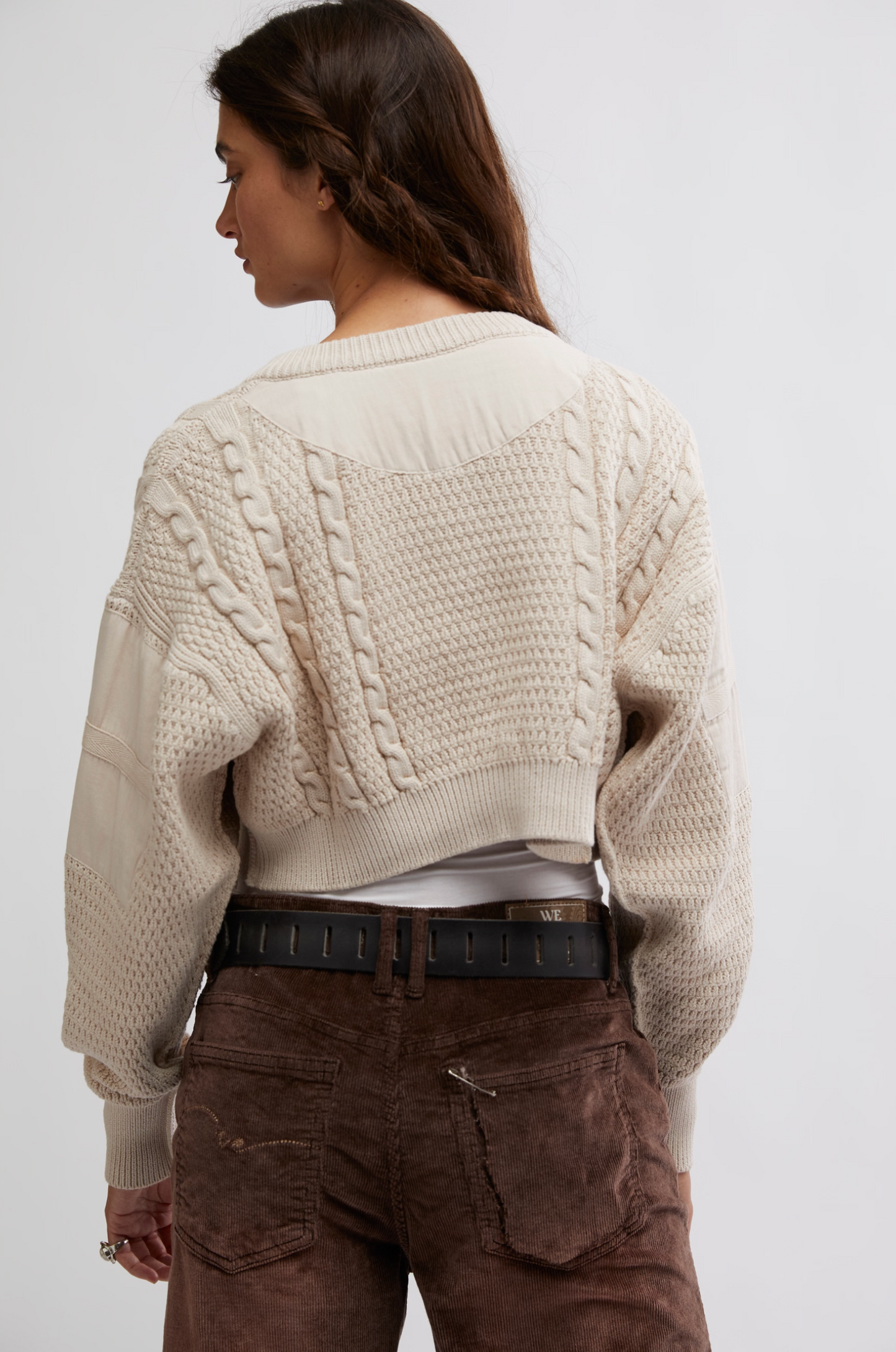 Features: Balloon-style sleeves, snap-button closures, classic cable-knit fabrication, ribbed trimming