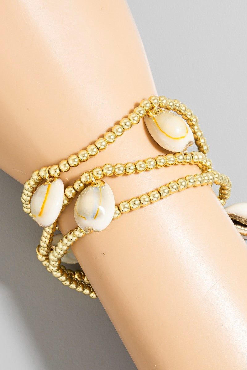 Imagine the soft glow of golden hour on your wrist with our multi-strand Gold Dipped Puka Shell Charm Bracelet. Three fluid strands of luminous golden beads cascade gracefully, each embracing an organic puka shell charm, meticulously kissed with a radiant golden interior. It’s a treasured collection of moments, designed for the woman who finds beauty in natural artistry and styles her world with heartfelt intention.