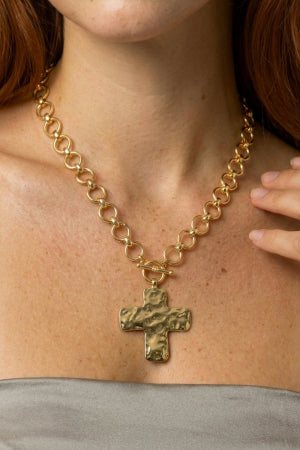 Embrace the art of self-expression with our Hammered Flat Cross Toggle Chain Necklace, a luminous golden adornment crafted for souls who collect moments, not just trends. Its substantial, interlocking ring chain cradles a beautifully irregular hammered cross, a testament to raw beauty and an artisanal touch that whispers tales of forgotten craft. The distinctive toggle clasp offers a touch of confident charm, making this piece not just jewelry, but a wearable statement that elevates your personal narrative from sunrise to your favorite midnight playlist.