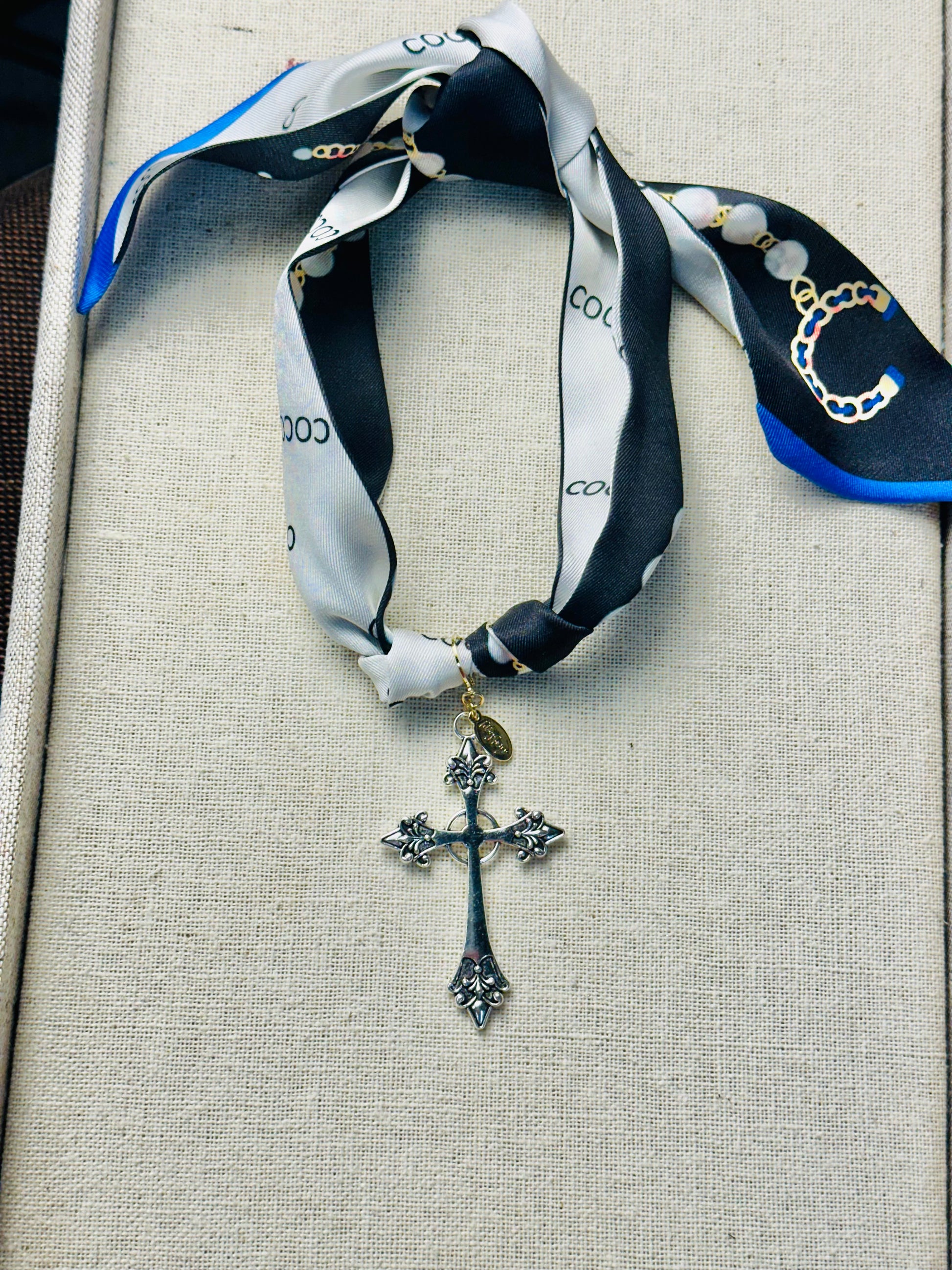 Silver plated alloy metal cross charm that can be clipped onto necklaces, purses, etc.