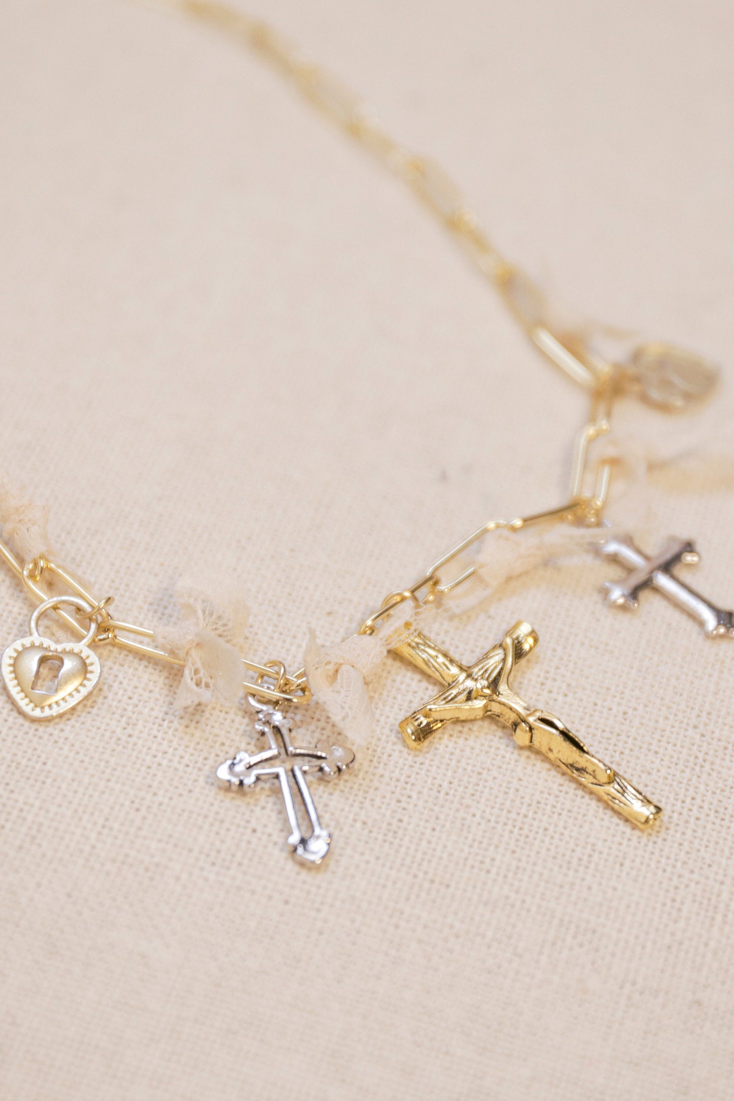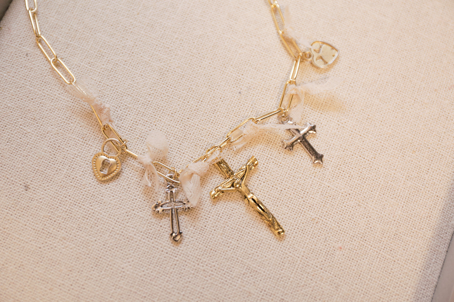 Gold and Silver plated stainless steel charms on 18kt gold pleated chain with vintage lace trim