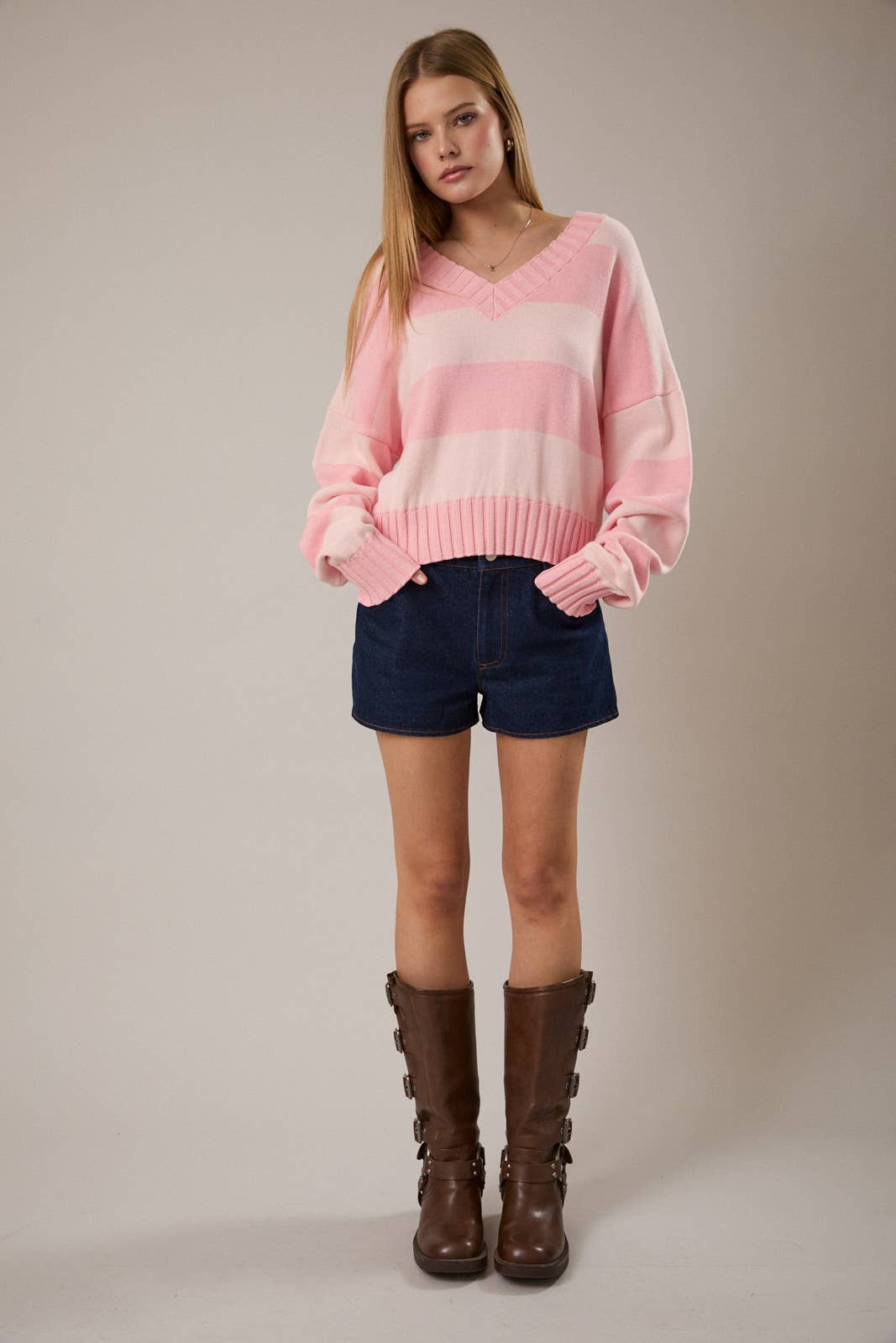 LONG SLEEVE V-NECK STRIPE CROP SWEATER