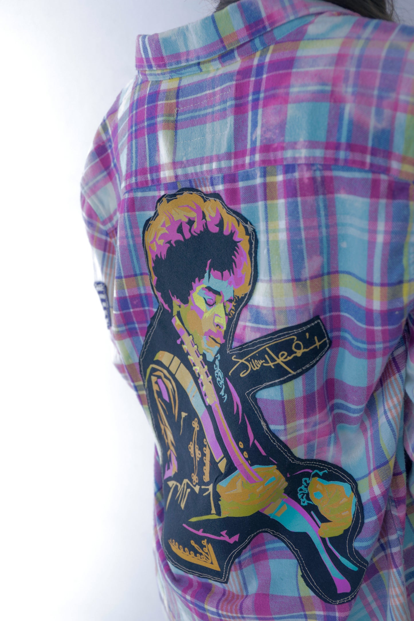 Flannel upcycled w/ bleach distressing, sequin fabric, graphic tee patches & vintage patches. 1 of a kind