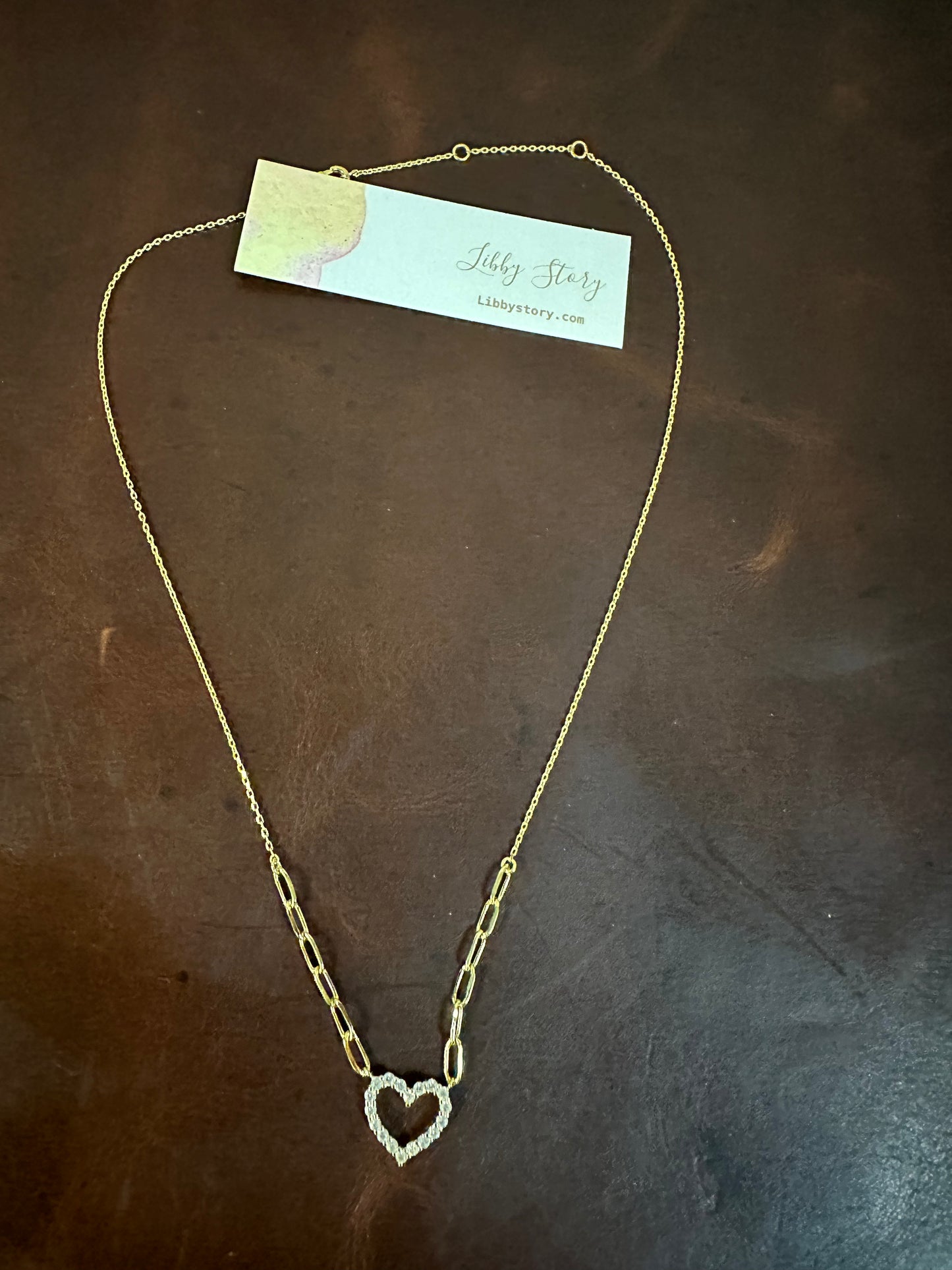 LUXE PAVE HEART OUTLINE BRASS NECKLACE WITH PARTIAL PAPERCLIP CHAIN