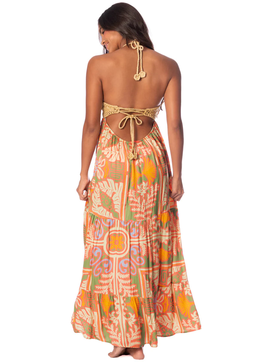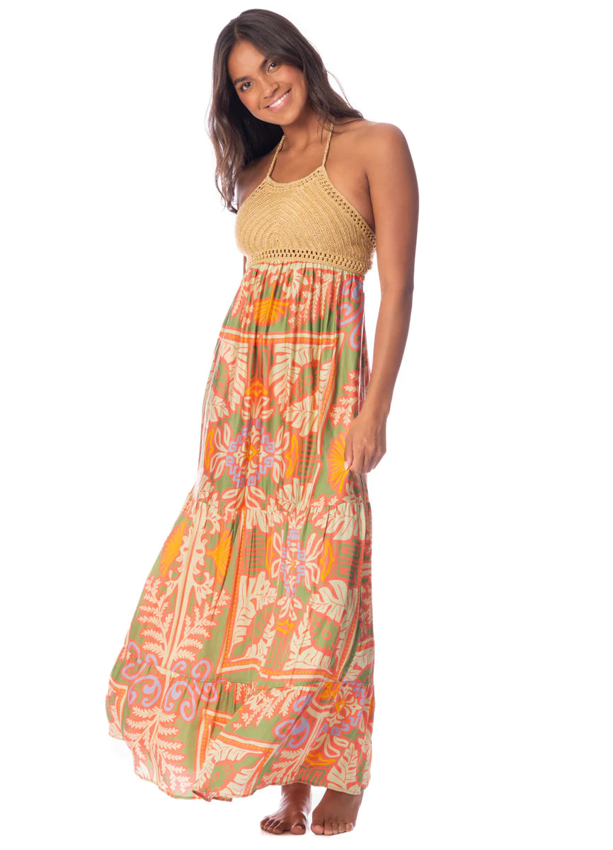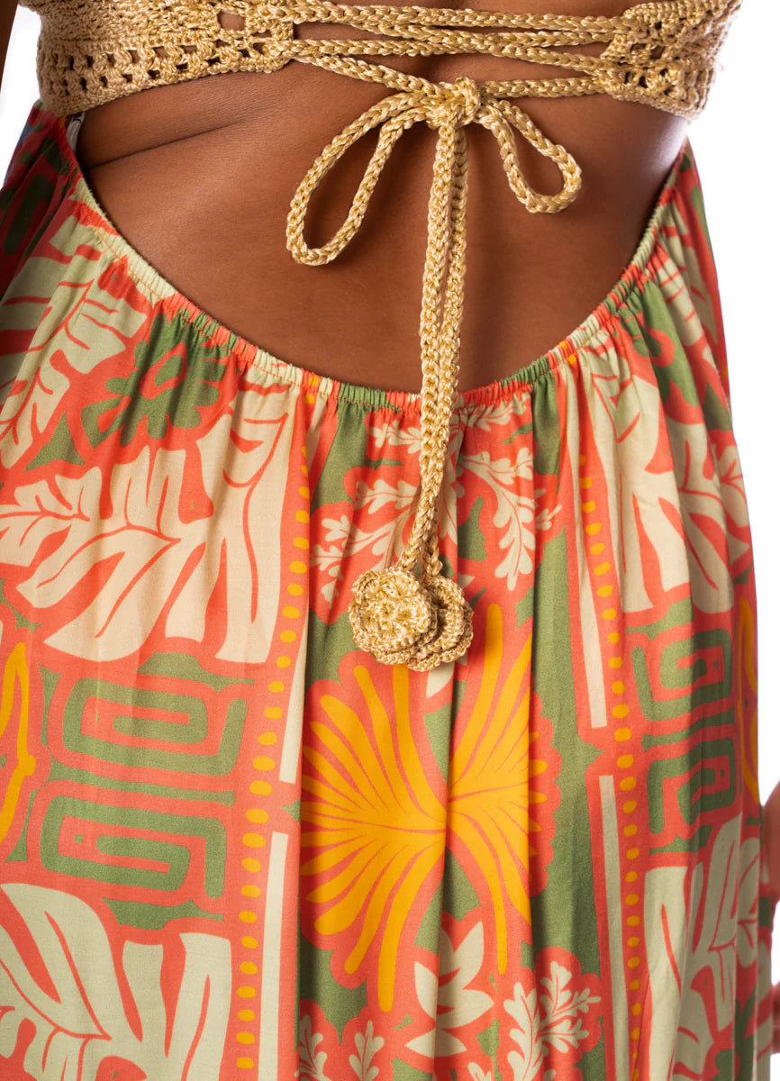 Awaken your inner hippie goddess in the Kairo halter top maxi dress. Tie on your crocheted top and let the full skirt flow in the breeze. Every occasion becomes your personal vacation moment of relaxation!
