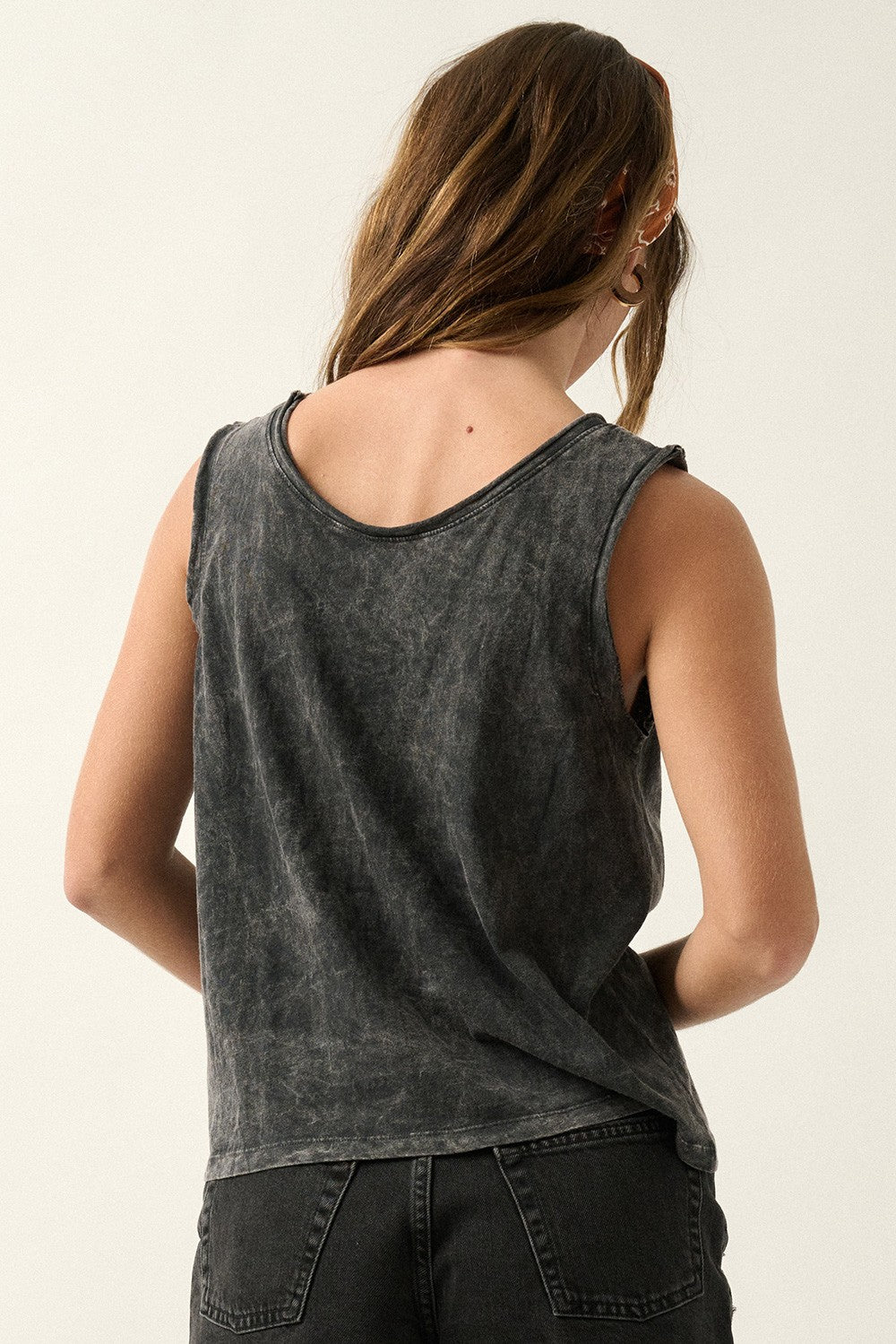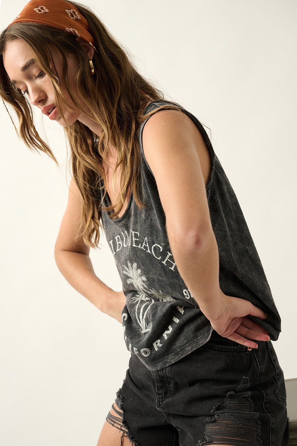 A mineral washed, graphic print tank top with the following features: Vintage-style graphic of palm trees with "Malibu Beach 1991 California" text print. Scoop neckline. Sleeveless. Raw edge arm holes. Low scoop back. Relaxed fit. Model Info: Height: 5 ft 7 in | Bust: 24 in | Waist: 32 in | Hips: 34 in | Wearing Size S.