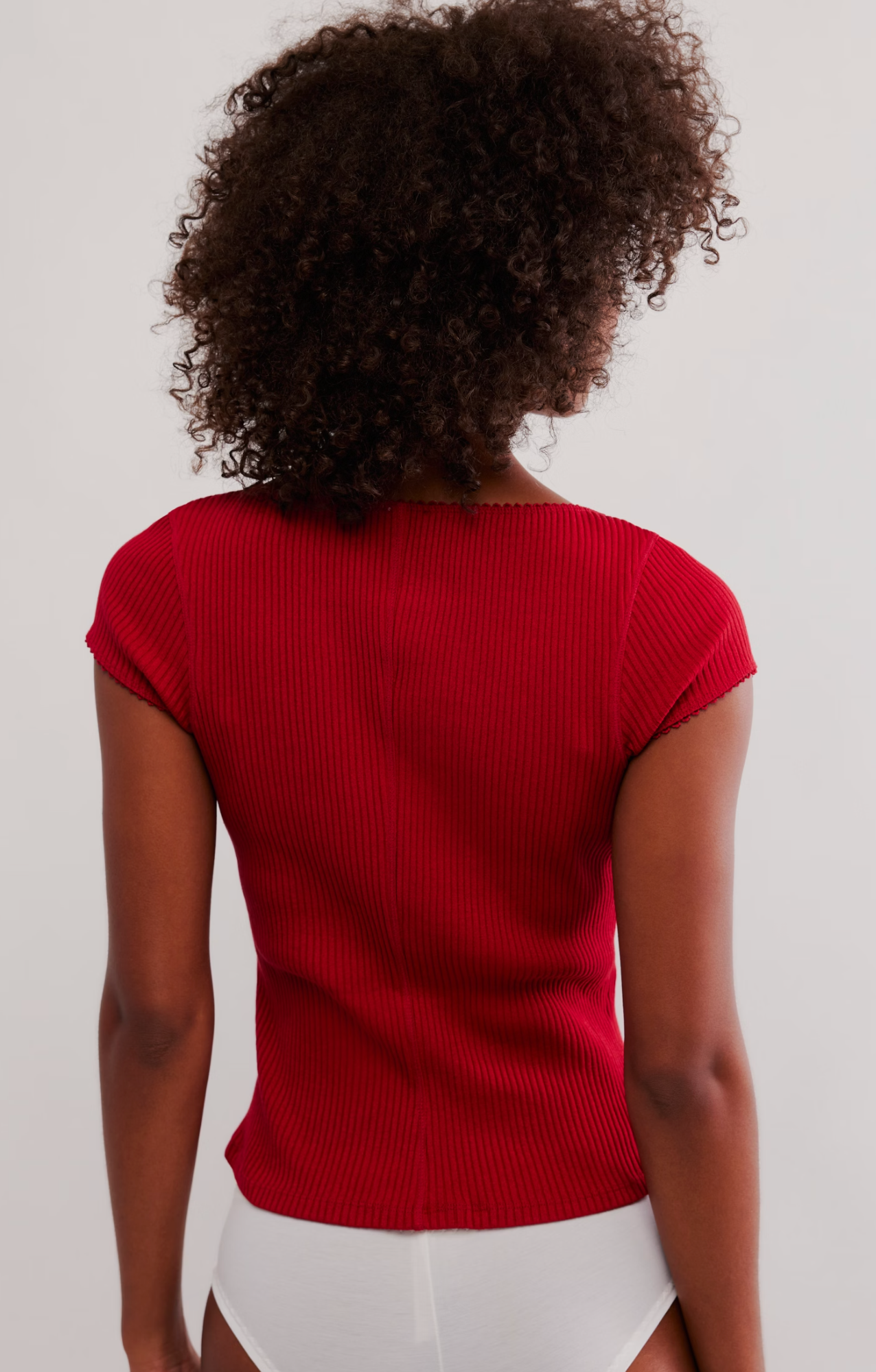 Cute and classic, this shrunken cardi is featured in a hugging ribbed fabrication with short capped sleeves and buttons all the way up the front.