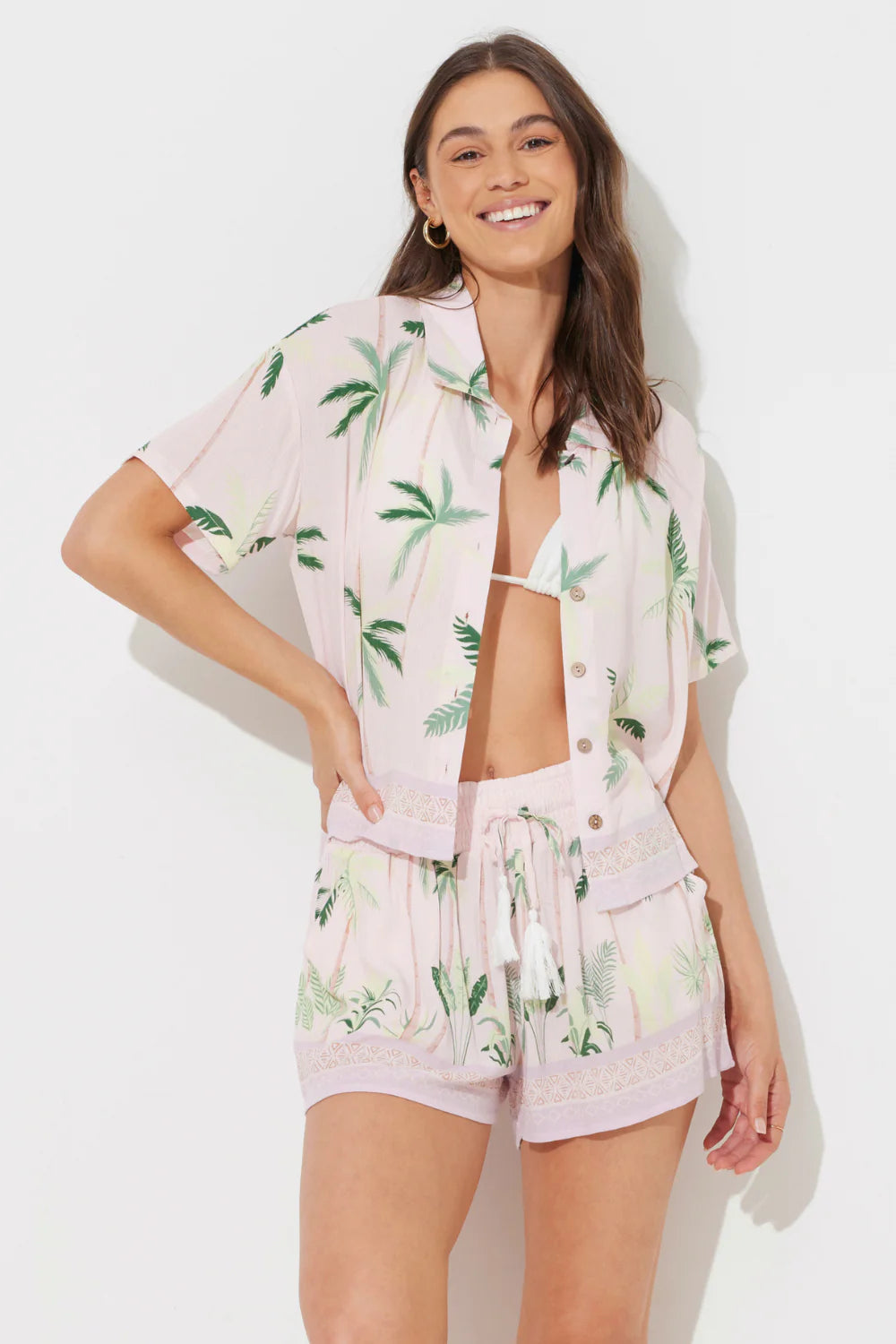 The Baby Pink W/ Tonal Green Printed Rayon Crinkle Camp Shirt features:
