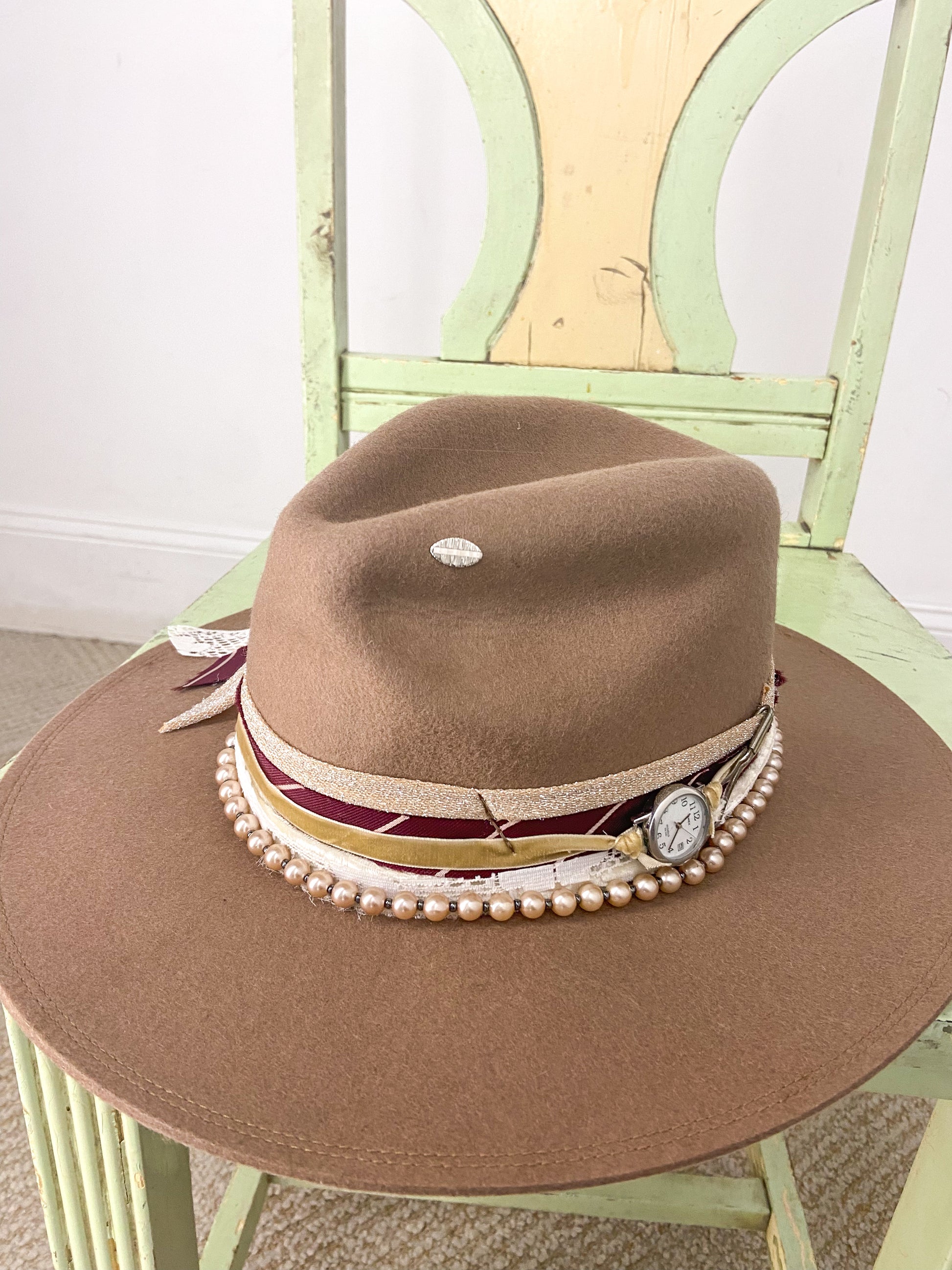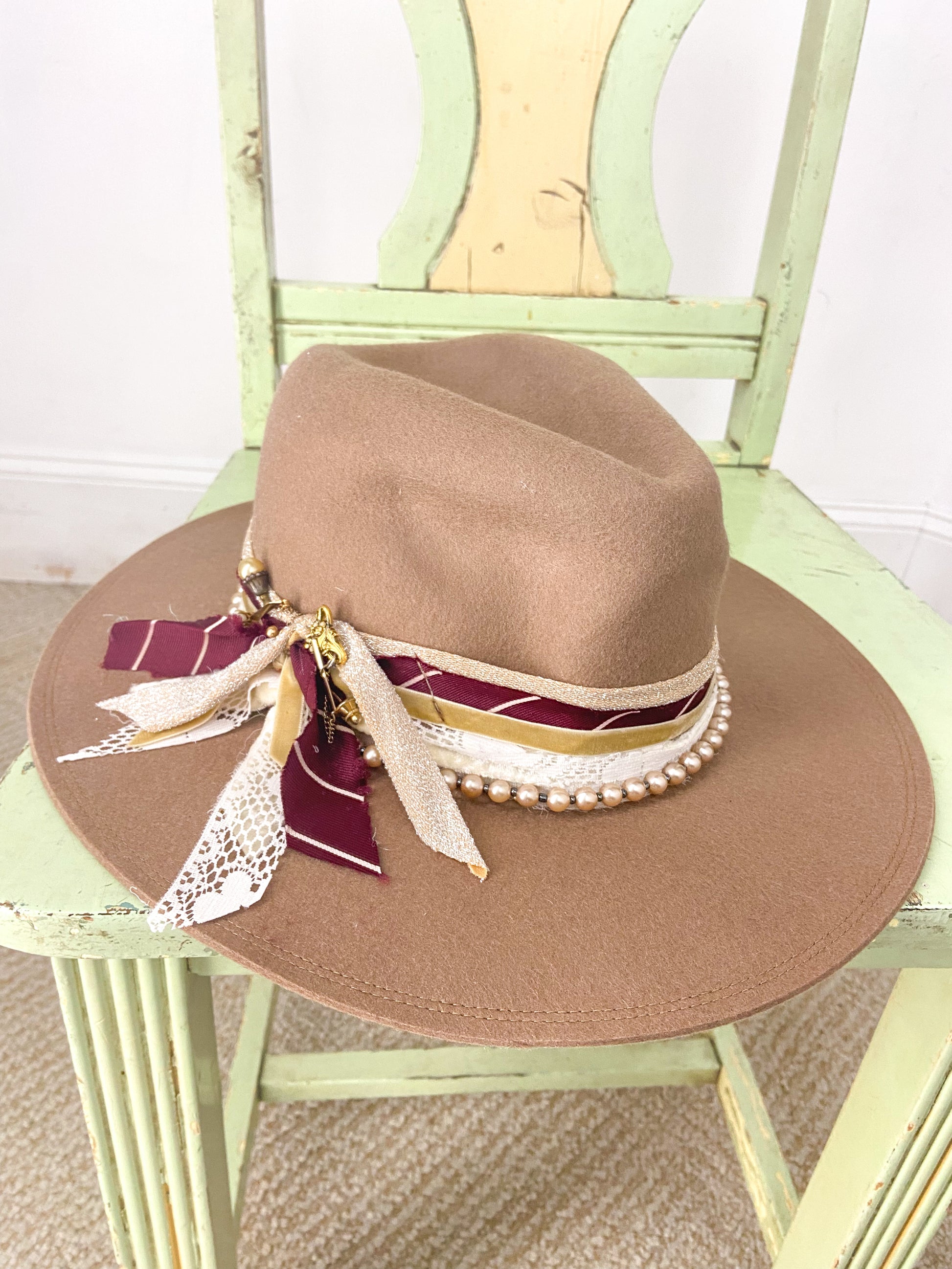 100% wool hat adorned with vintage tie, velvet, lace, vintage pearls and hat pins. Satin lining.