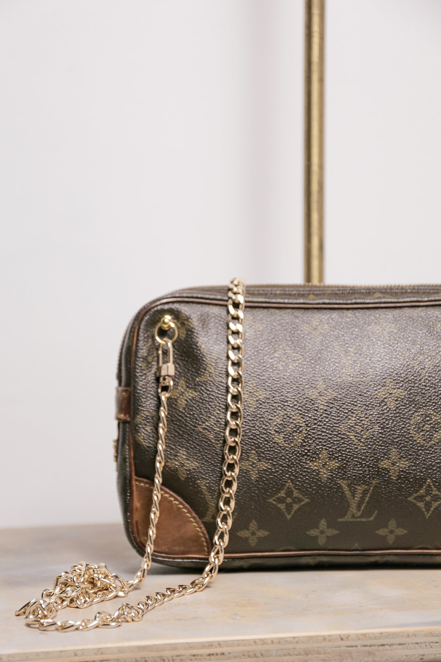 Authentic Vintage LV Clutch refurbished and new pocket linings added and upcycled with hardware and cross body chain and handmade purse charm