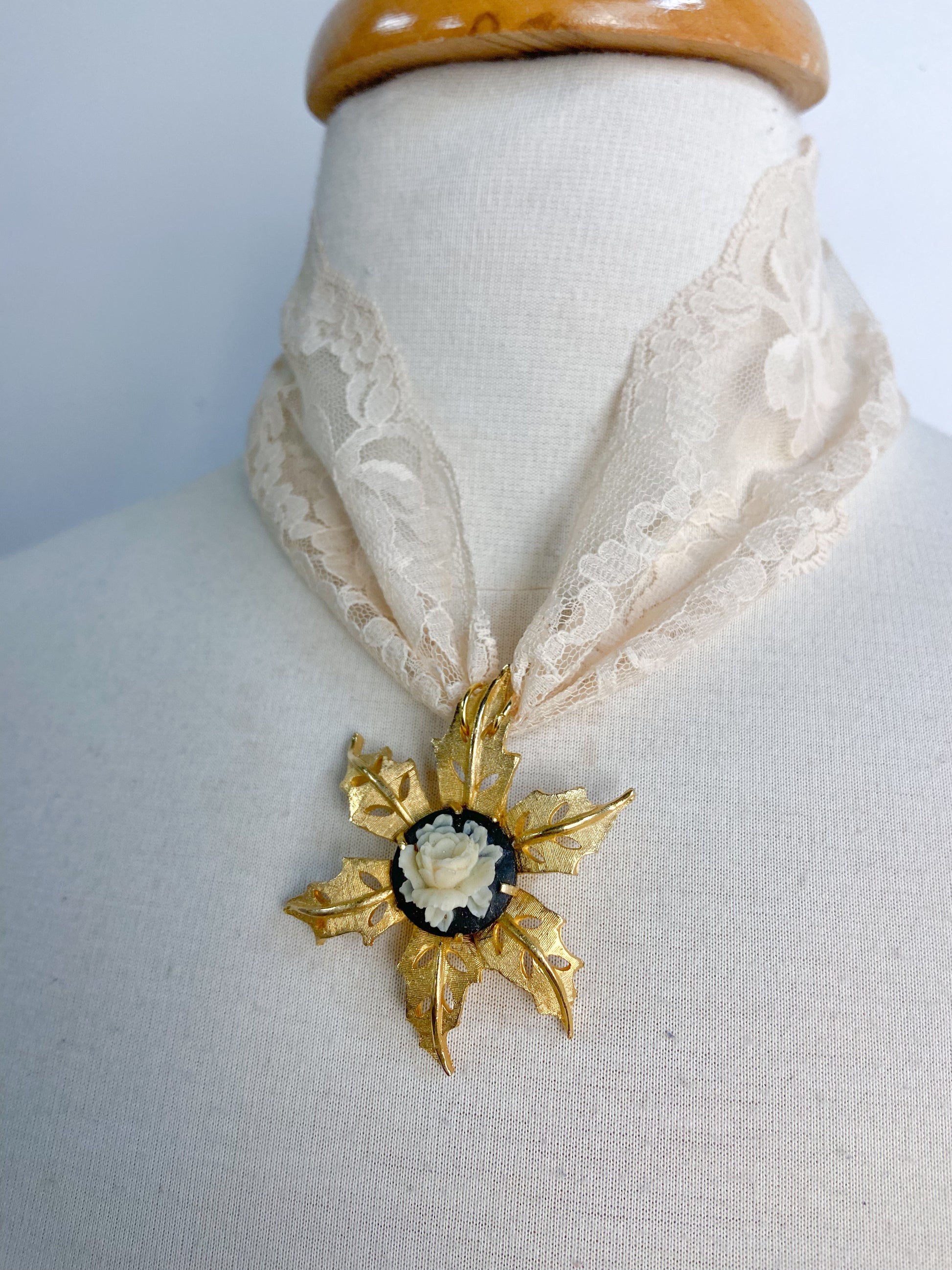 Vintage broach converted into a pendant with a floral cameo center on vintage lace.
