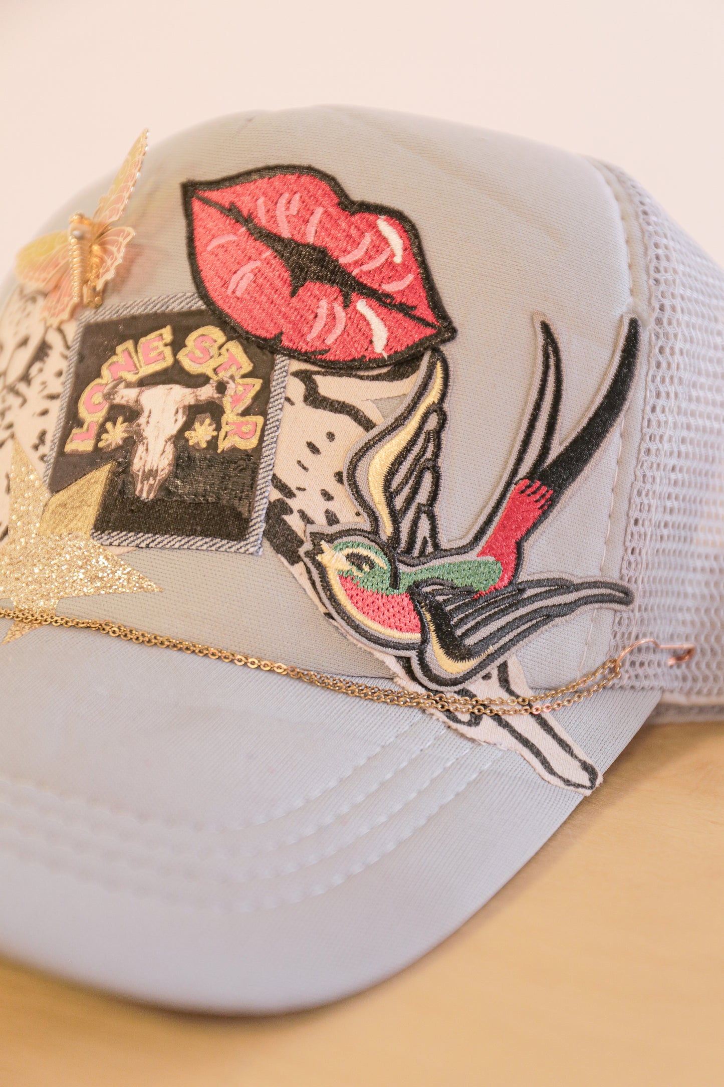 Funky trucker hat made with embroidered patches, hand made patches,, a vintage butterfly pin. Each pin will vary on each hat for a one of a kind look