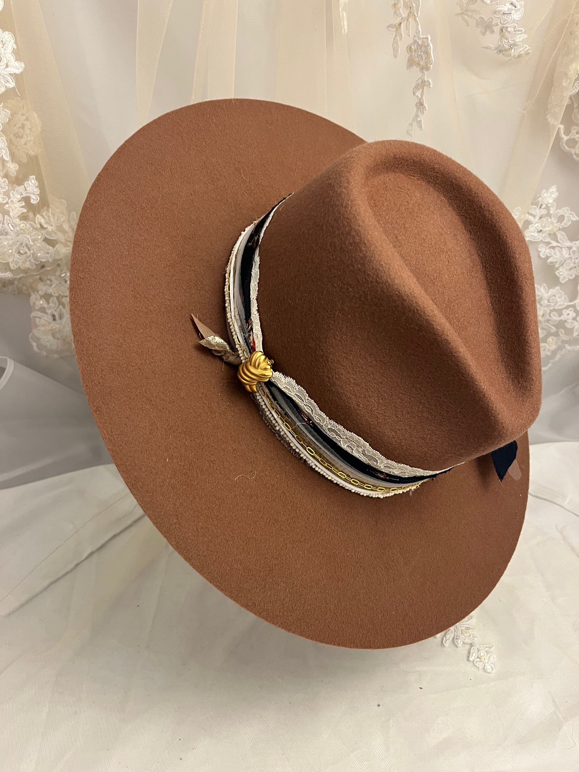 100% wool stiff brim hat adorned with a vintage tie, vintage lace and trim, gold chain, a vintage earring, fresh water pearls, and feathers.