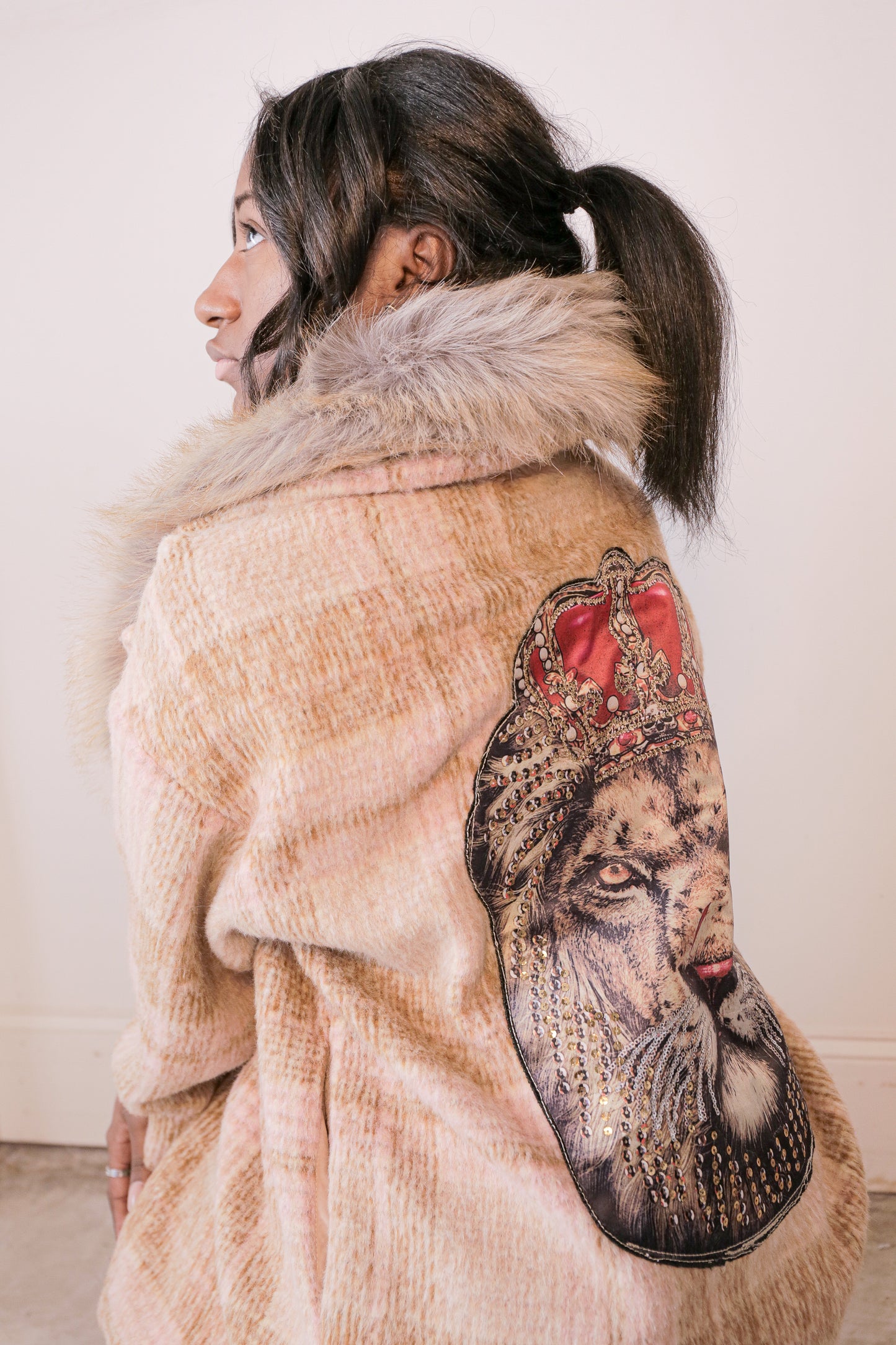 Lined plaid coat embellished with a removable fur collar and large embroidered patch