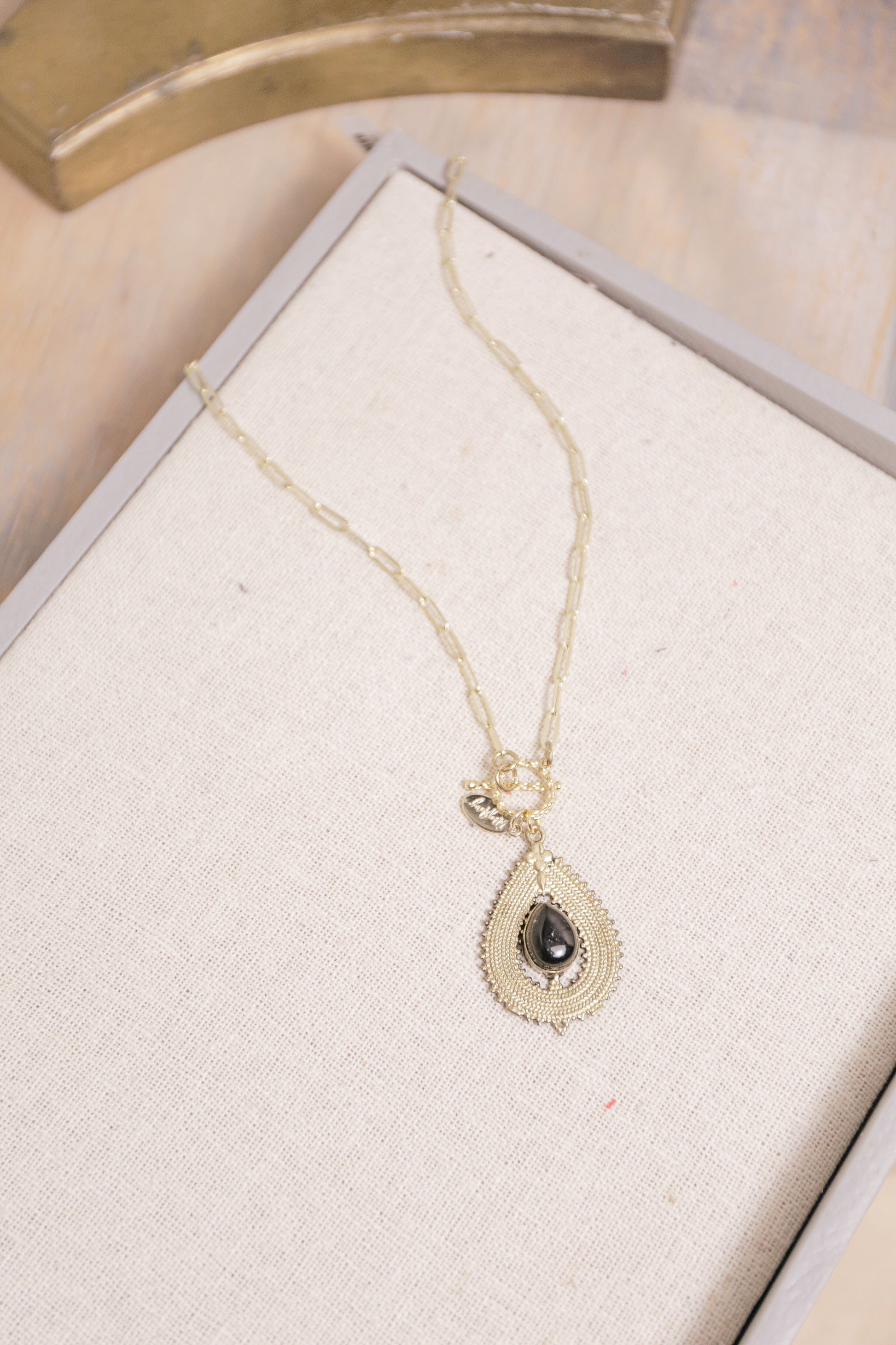 Onyx and brass pendant on 18kt gold filled chain
