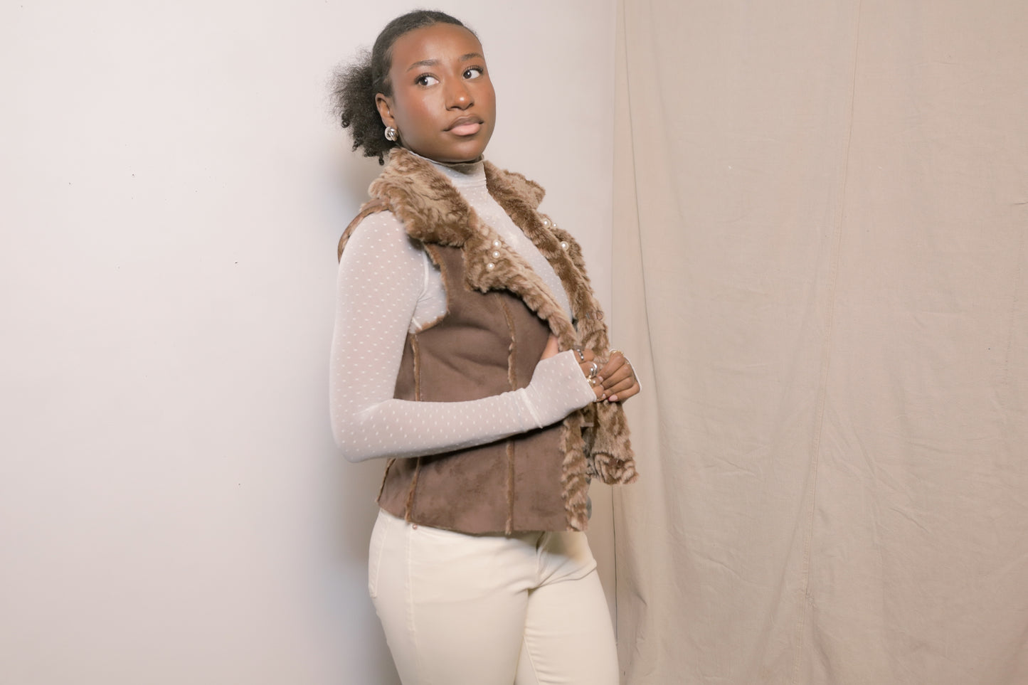 Faux suede and fur vest made reversible and cropped. Pearl pins added