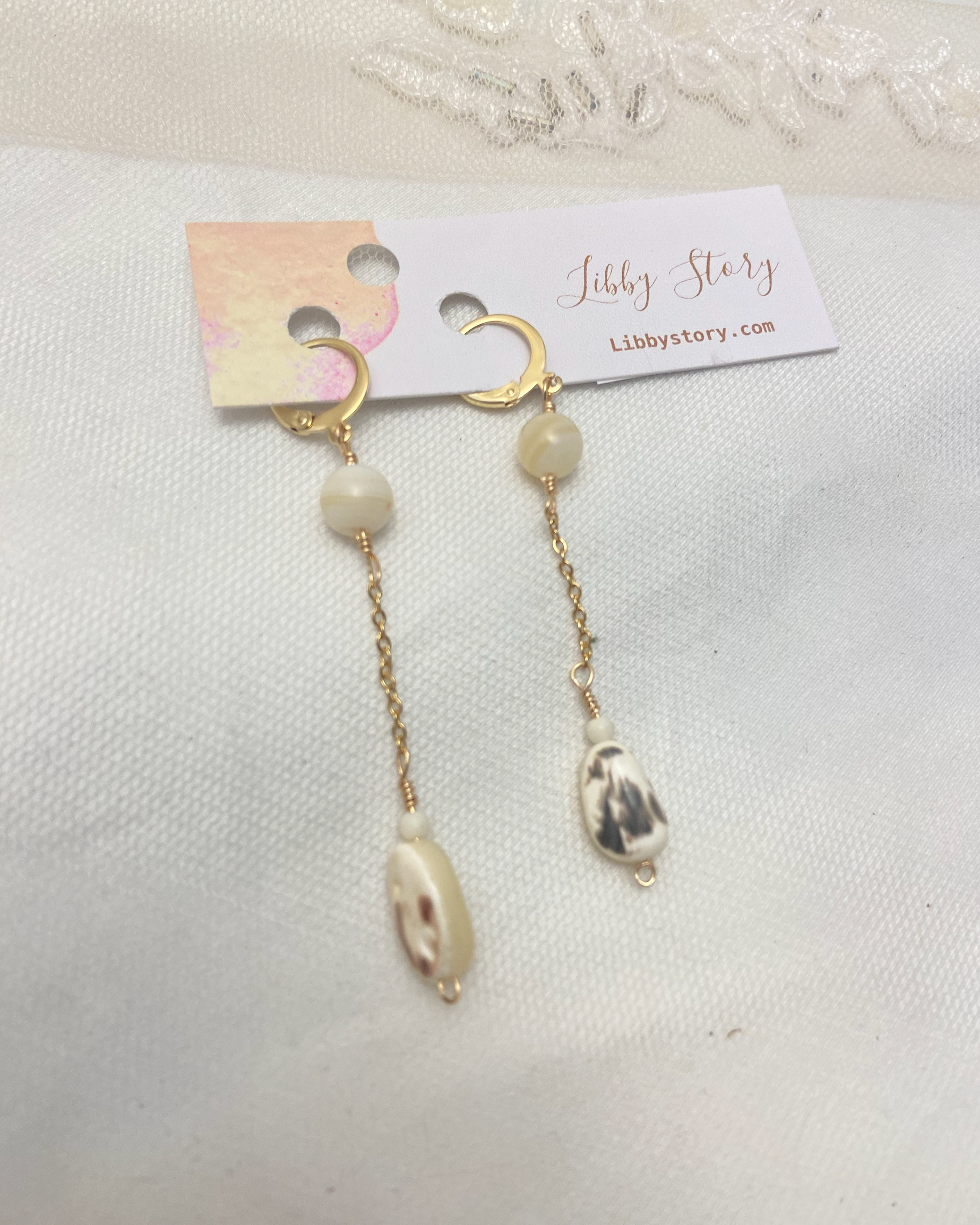 Vintage shell beads, gold plated brass chain and 18kt gold plated ear huggies.