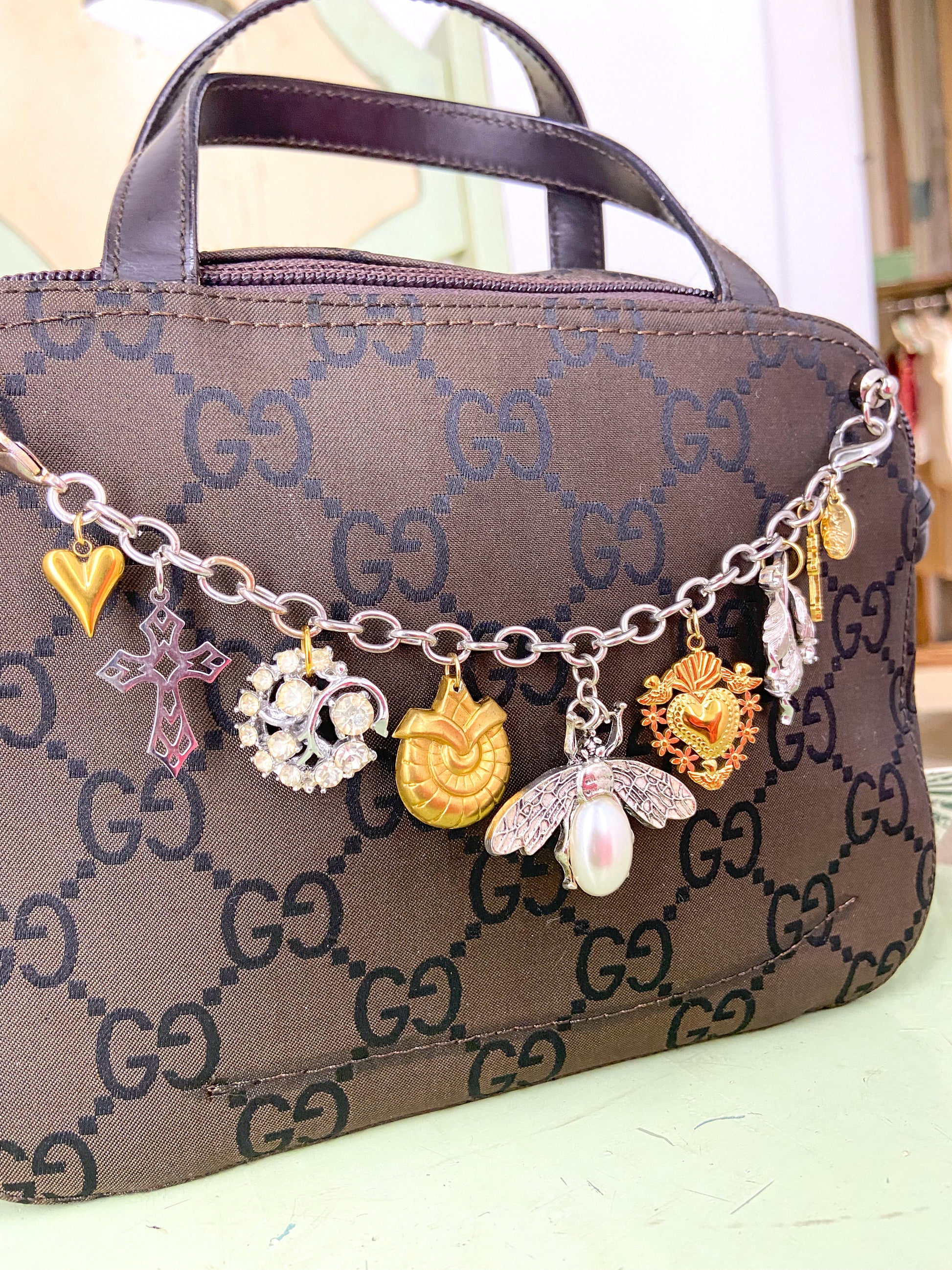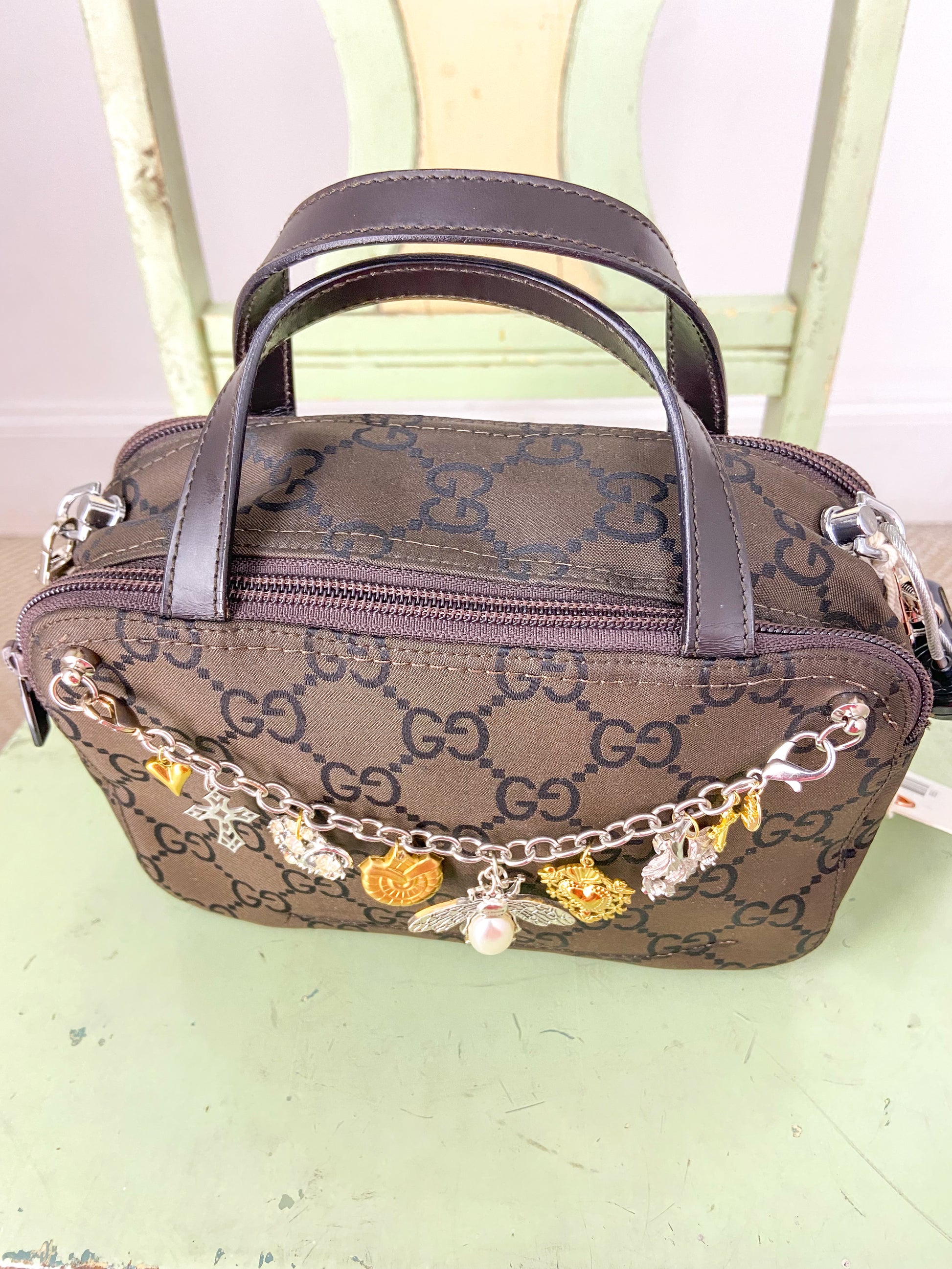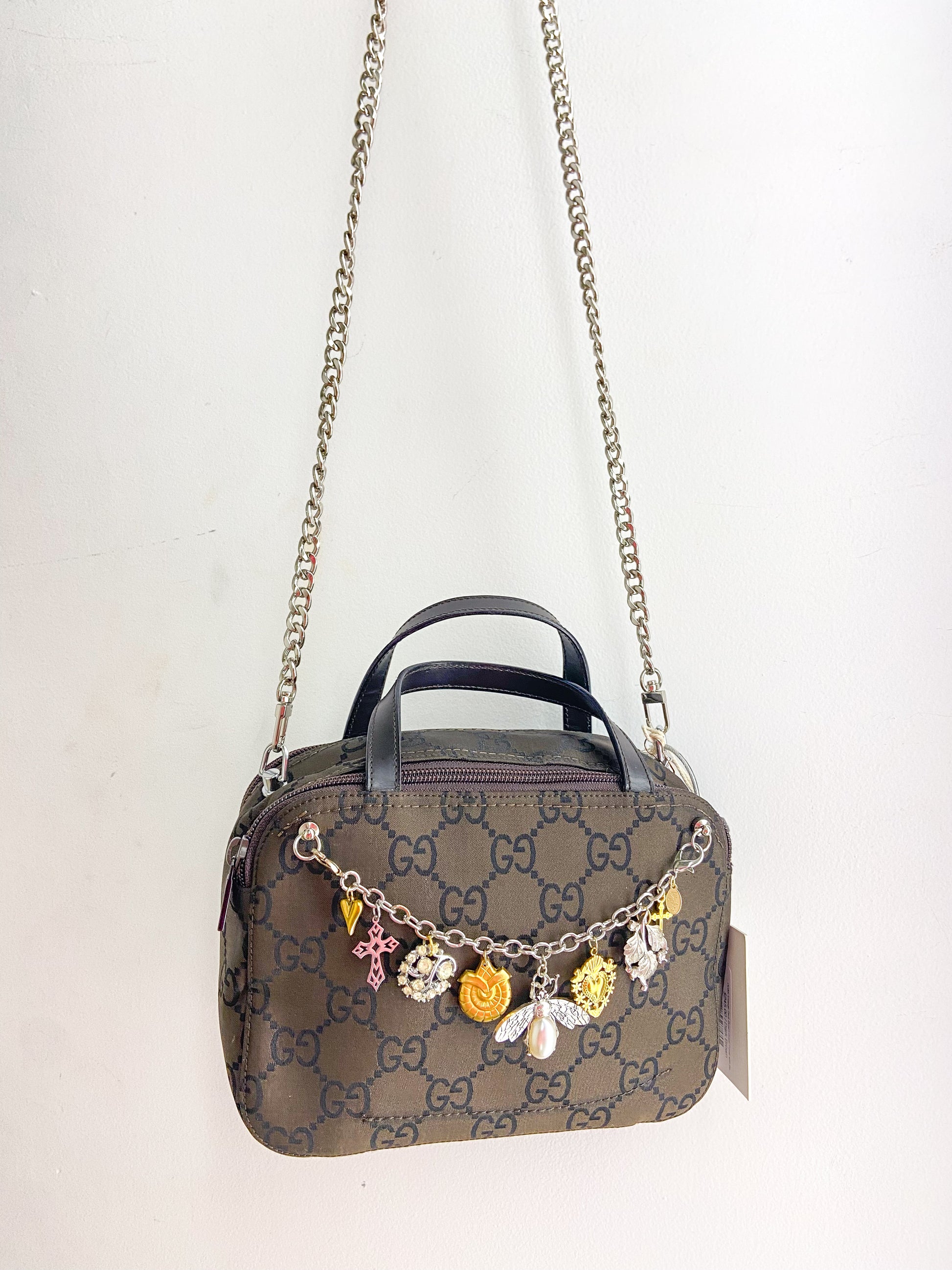 Authentic vintage Gucci cosmetic purse converted into a small purse with detachable crossbody chain and handmade bag chain with charms