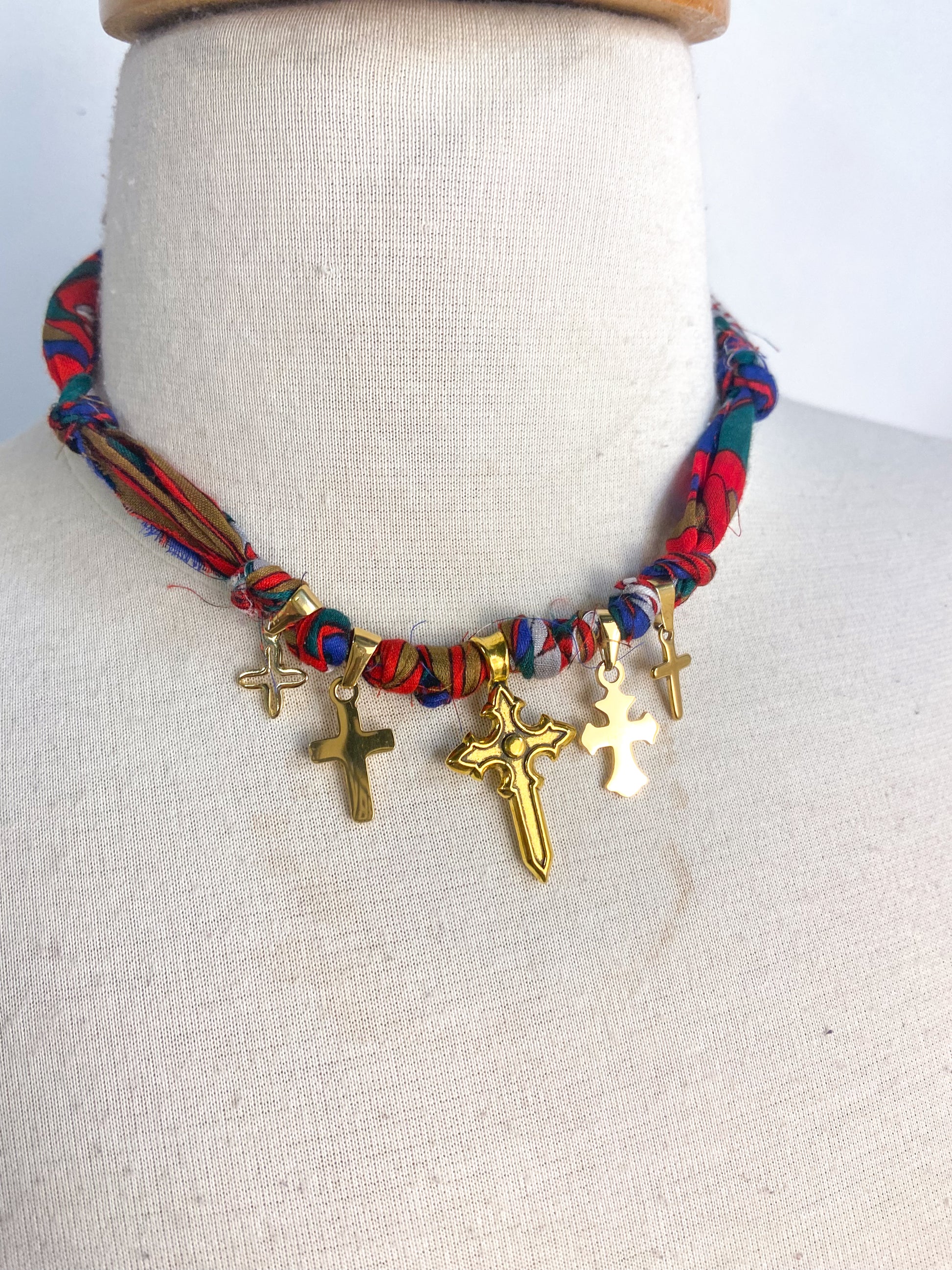 OOAK Crossed Paths Vintage Scarf and Cross Medallion Necklace