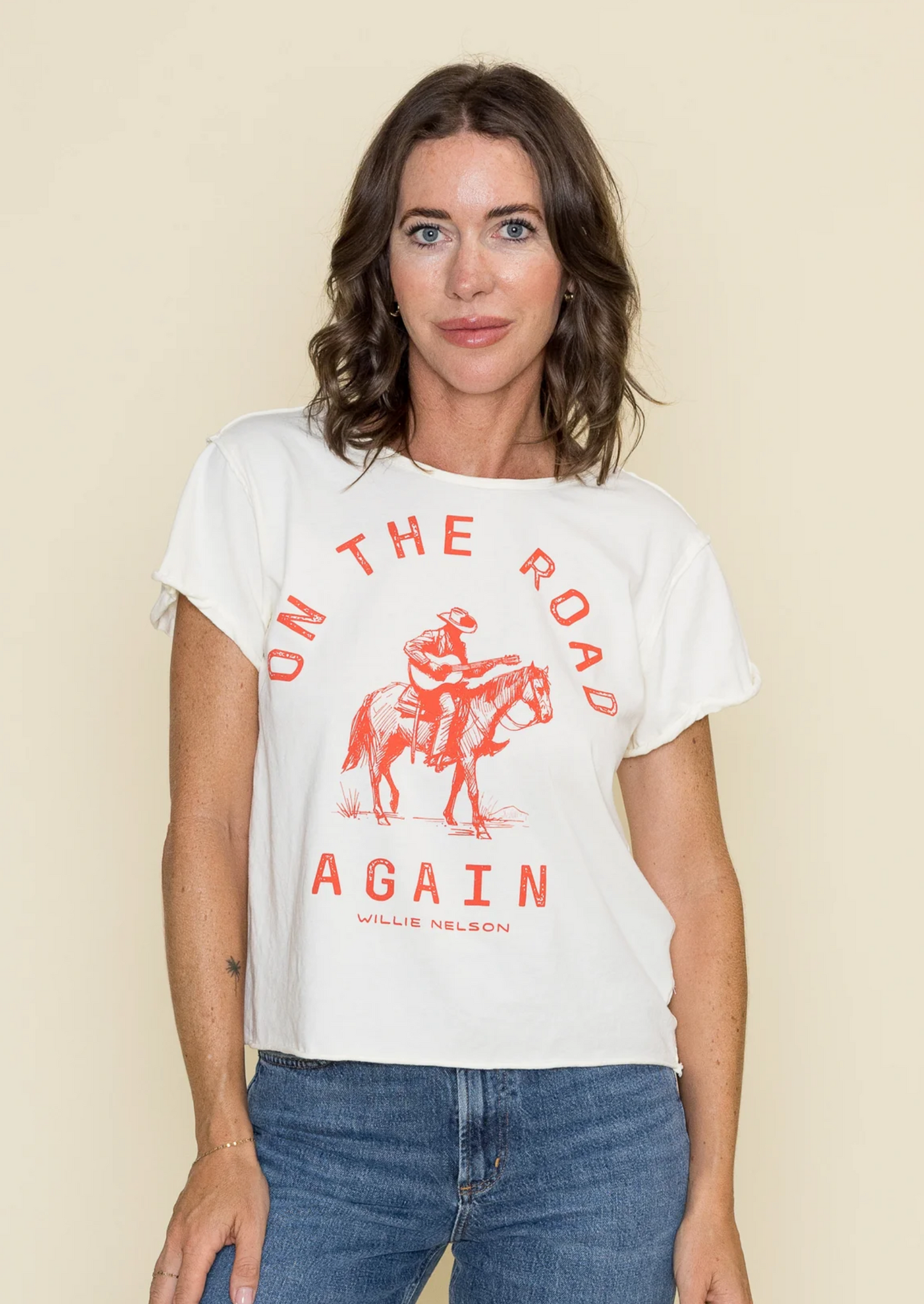 Inspired by the song of the same name, this On The Road Again T-Shirt is sure to be a favorite amongst fans everywhere. This classic tee features a vintage-inspired design, capturing the spirit of Willie Nelson's timeless music. Made from soft and comfortable cotton, it's the perfect addition to any fan's wardrobe.