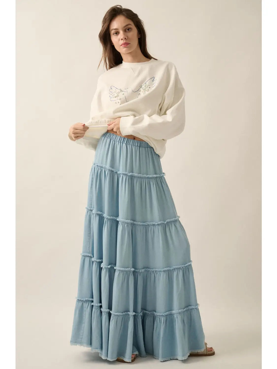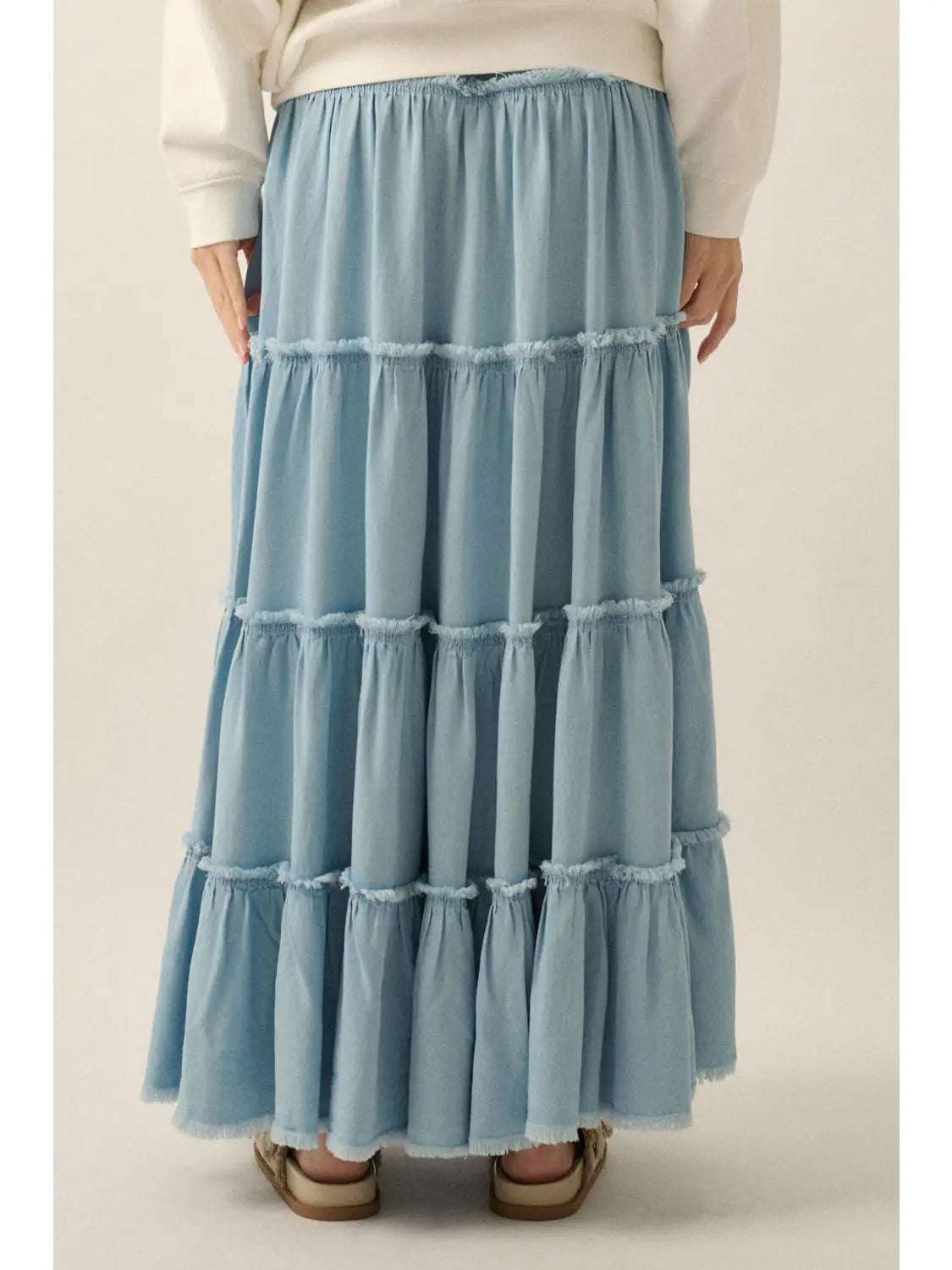 A solid woven denim maxi skirt with the following features: Tiered ruffle design with raw-edge detailing. Elastic waist. Raw-edge hem. Ankle length. Loose fit.