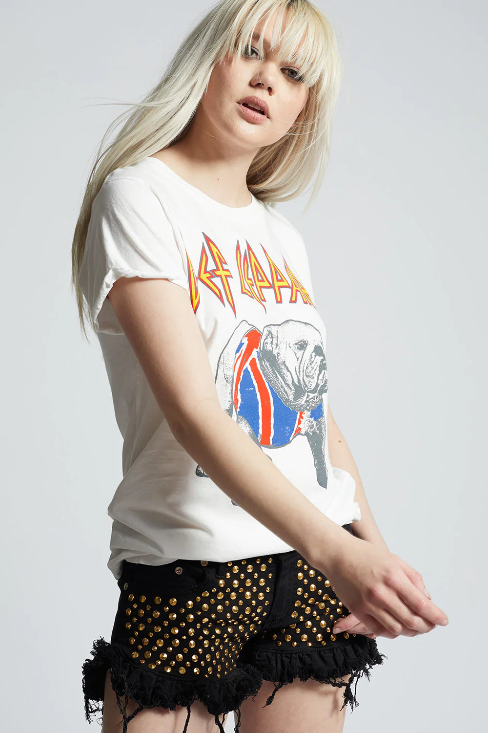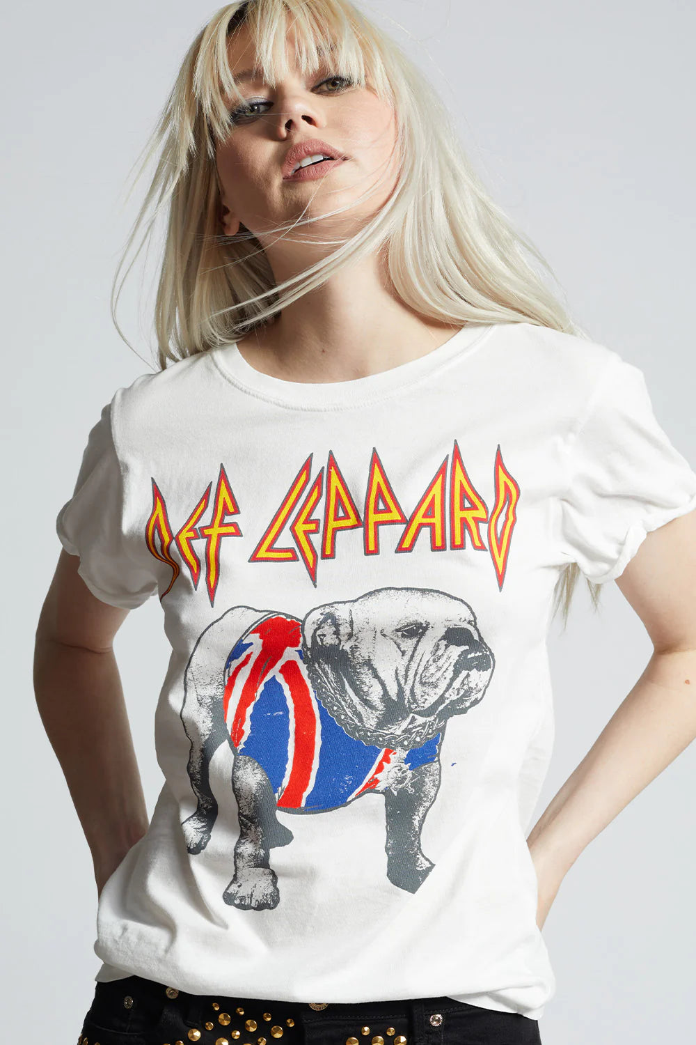Featuring Def Leppard's Union Jack bulldog graphic with their classic "Def Leppard" logo. Made with soft cotton fabric, a ribbed crew neckline, distressed hems, rolled short sleeves, and a slim fit.