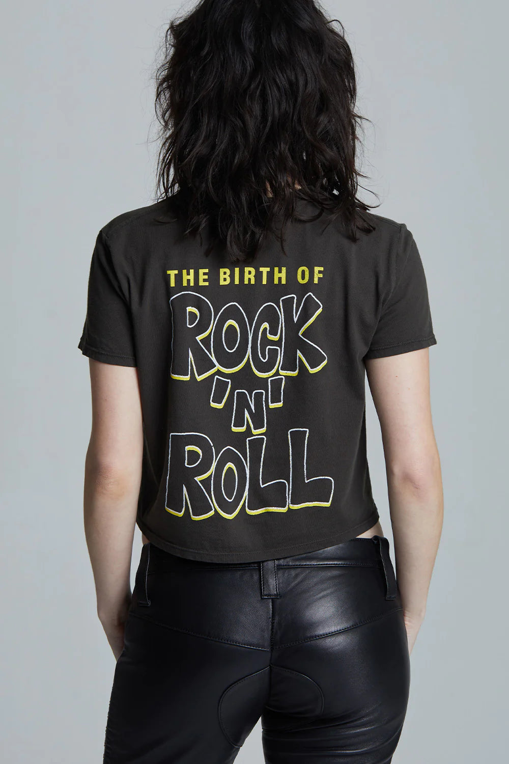 This Sun Records x Elvis Presley Rock 'n Roll Cropped T-Shirt features their classic logo on the front, with "The Birth Of Rock 'N' Roll" on the back. Made with soft cotton fabric, a ribbed crew neckline, short sleeves, and a slightly fitted style.