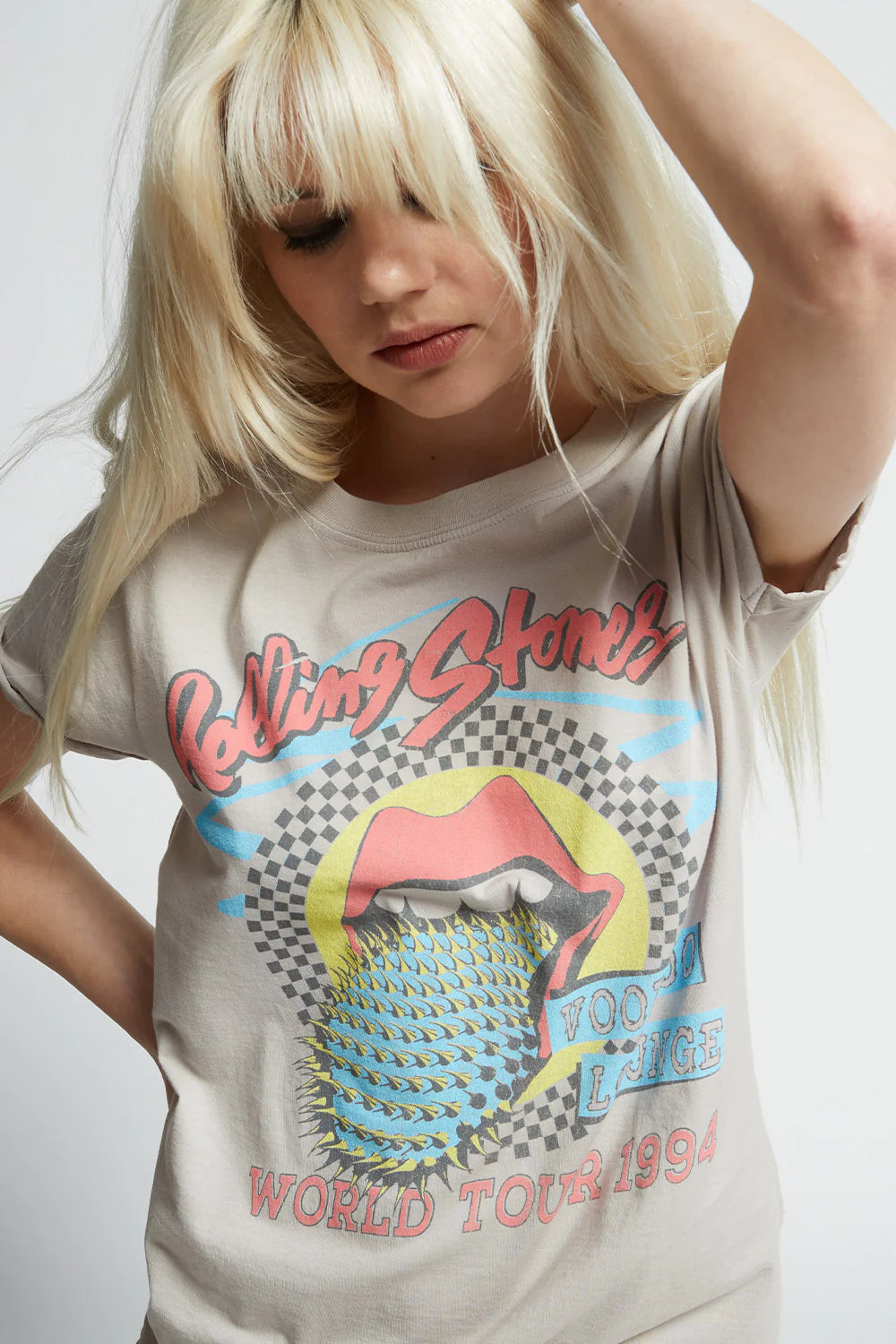 Keep the rock alive with this tee based off the Rolling Stones' studio album, "Voodoo Lounge" and 1994 World Tour. Featuring the iconic Rolling Stones’ tongue with metal-studs and ring of dice-print in the front and additional tour graphics and dates with cities in the back. Made with soft 100% cotton, a ribbed crew neckline, rolled short sleeves, distressed hems, and our classic fitted style.