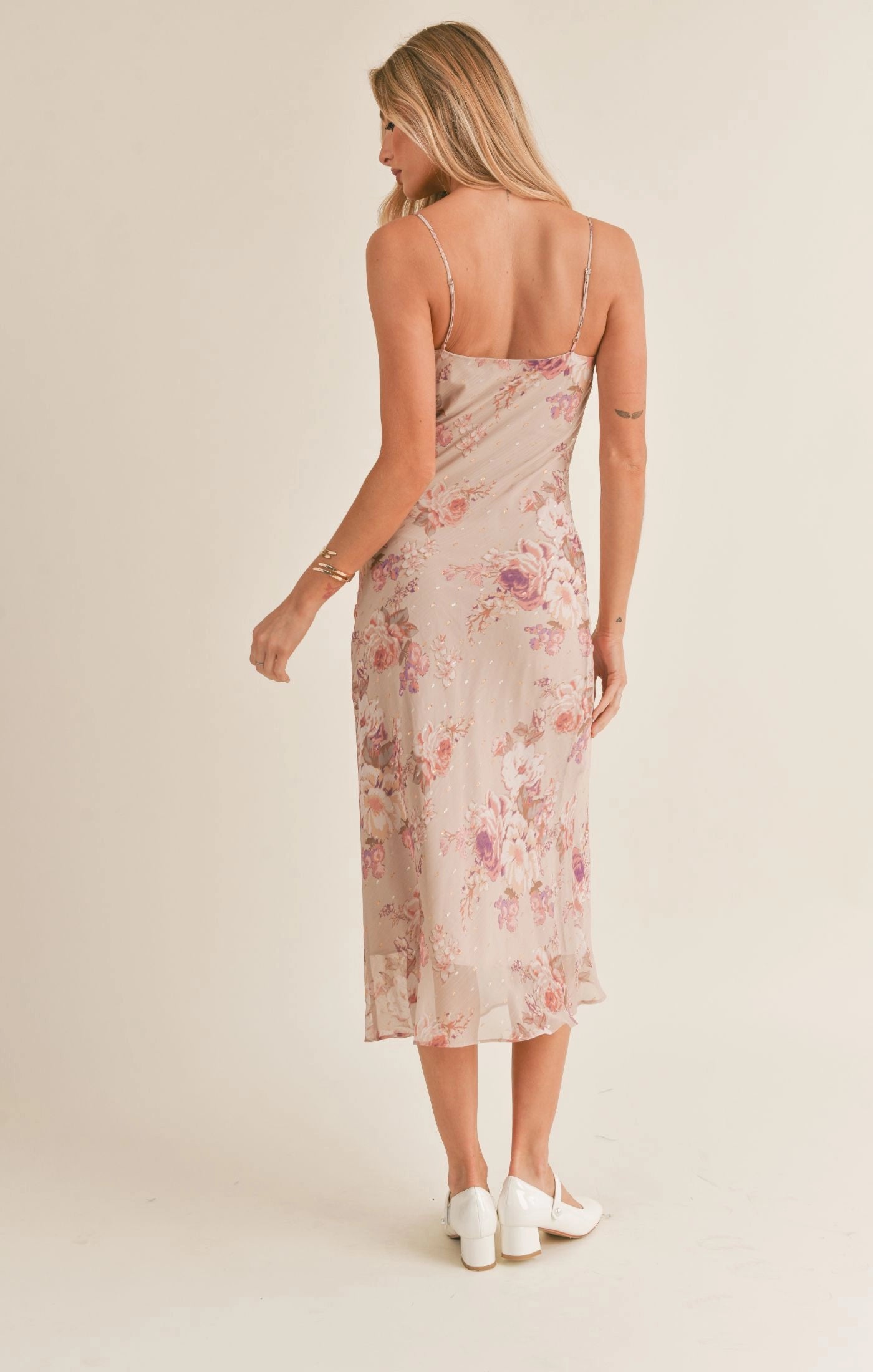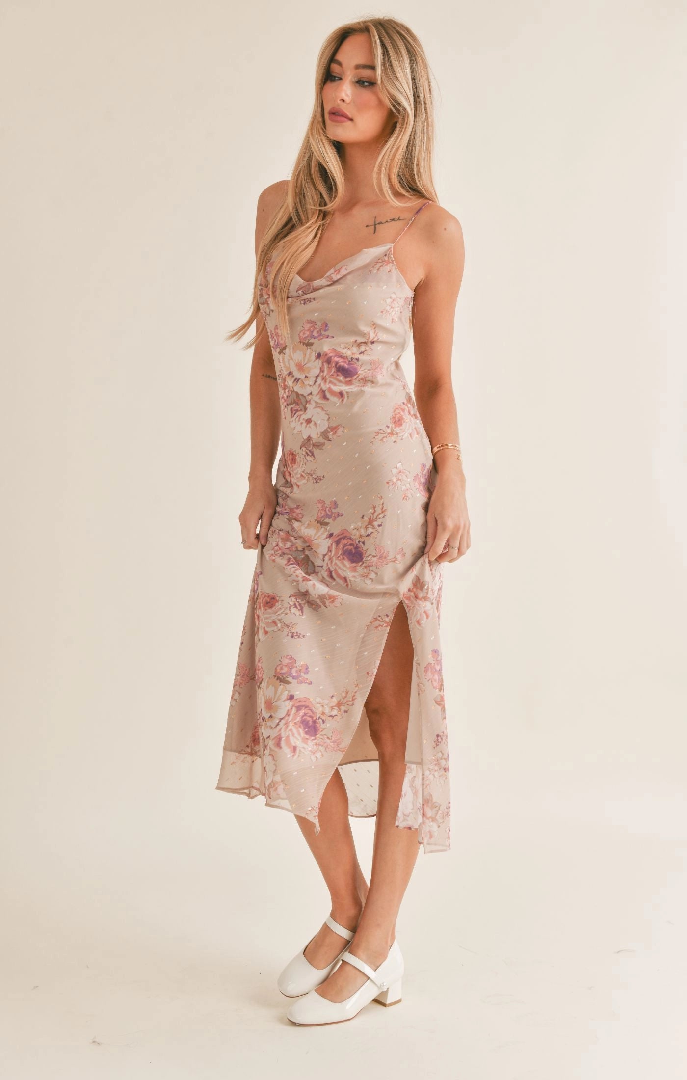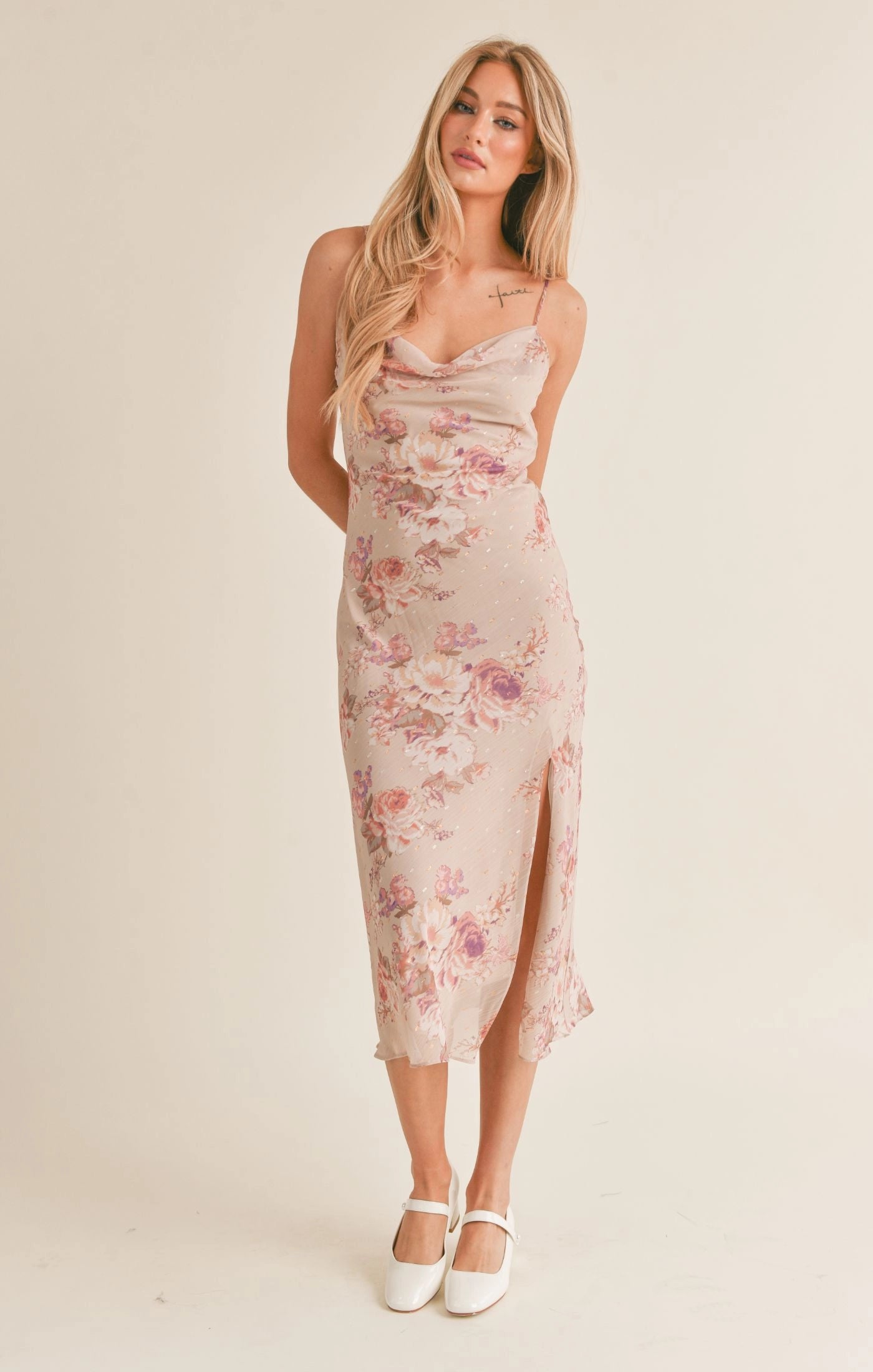 Celestial Midi Slip Dress is a midi slip dress with a cowl neck. Comes in a lovely beige multi color.