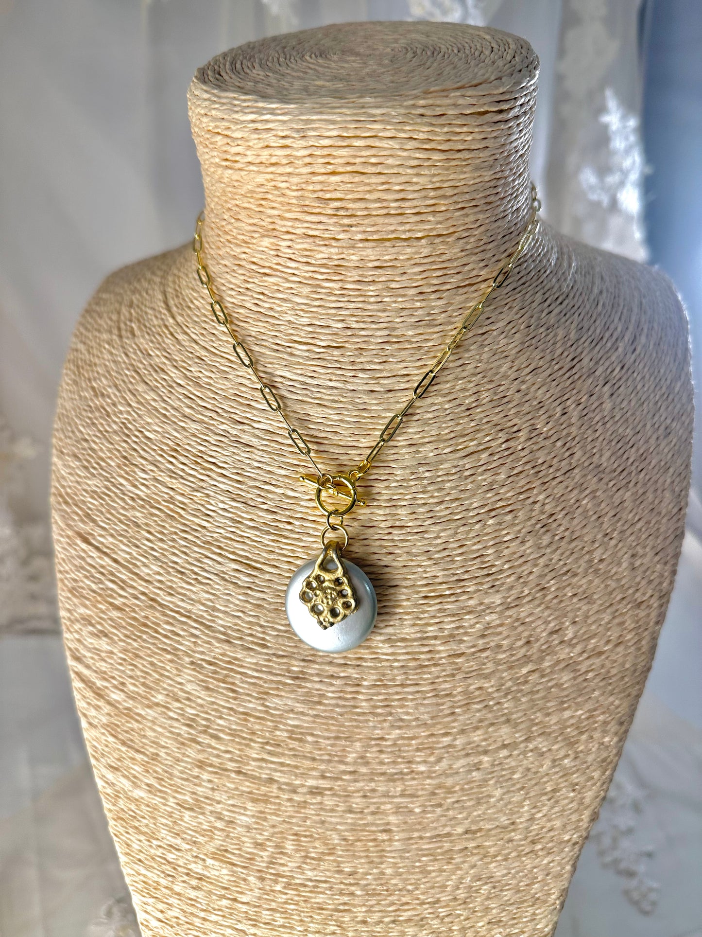 Vintage earring converted to pendant on 18kt gold plated brass chain approx. 16" long.