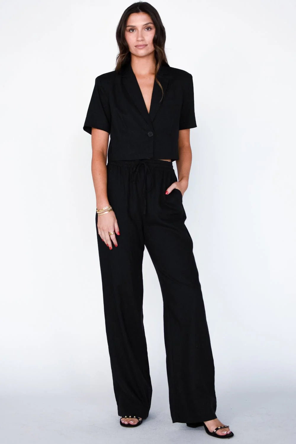 Stay chic and stylish this summer with our Fayette Blazer by Steve Madden, perfect for any occasion. This cropped black top features a collared deep v neckline and short sleeves for a relaxed and flattering boxy fit. Pair with the matching Venetia Pant for a effortlessly chic styling or wear with a high waisted jean for a casual cool girl look!