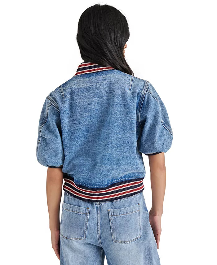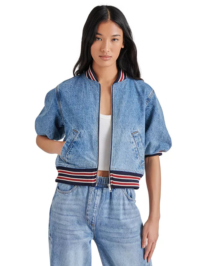 Steve Madden modernizes the bomber jacket with denim fabric, a cropped hem and short sleeves.