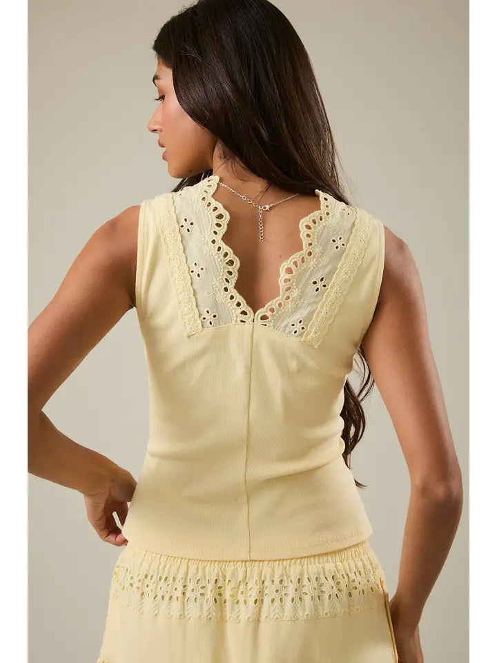 Embrace the whisper of golden hour sunshine with our Tie Front Vest, meticulously crafted in a delicate buttercup hue. Its intricate eyelet lace trim and artfully placed tie-front details evoke a nostalgic charm, inviting you to curate your own distinctive style. A true testament to lived-in romantic femininity, this piece drapes with an effortless grace, perfect for collecting moments under a summer sky or amidst creative reverie.