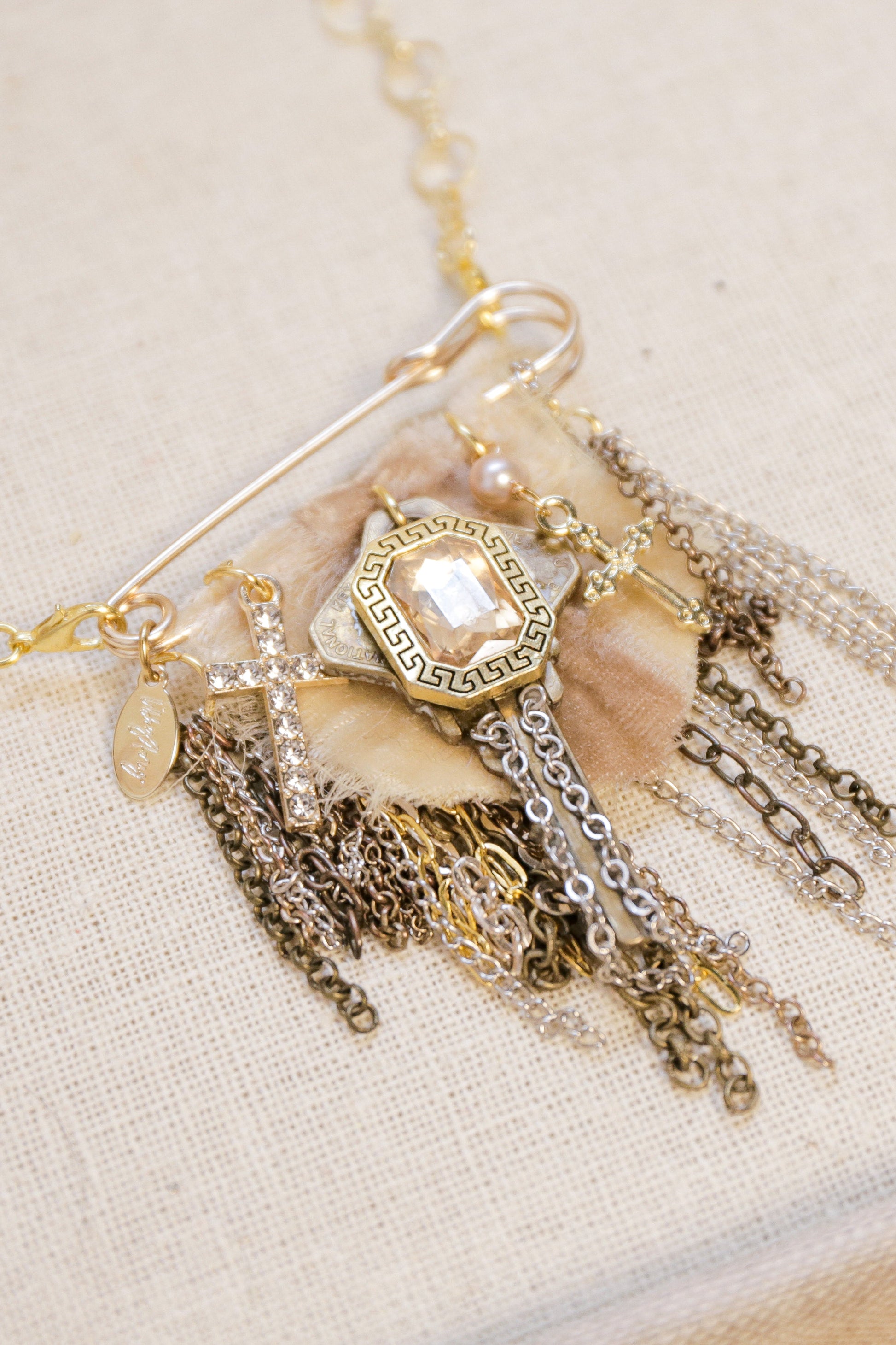 Velvet ribbon brooch necklace on 18kt gold plated chain. Embellished with vintage key, gold plated cross charms, and fresh water pearl.