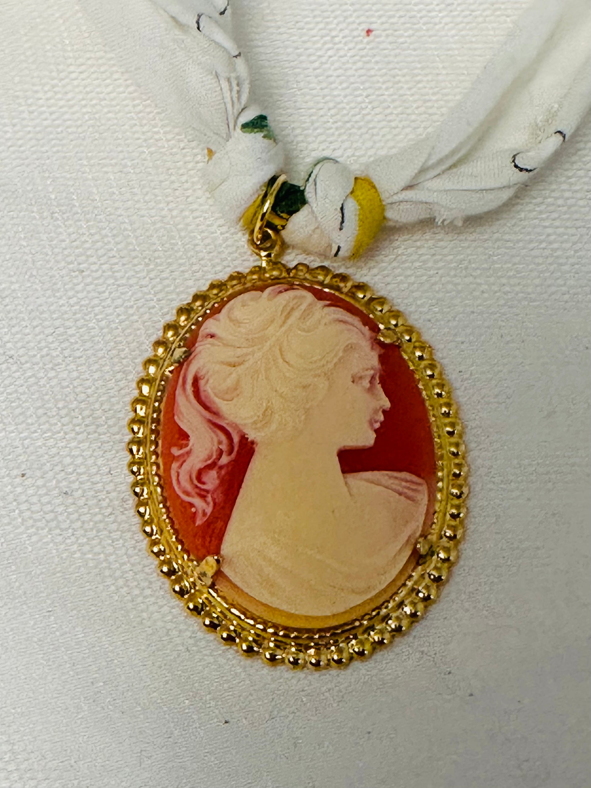 Handmade vintage resin cameo and vintage handkerchief . Handkerchief print may vary for each necklace . Can be custom done.. message us for custom pieces