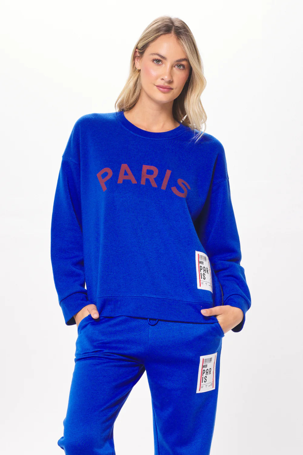 The Royal Blue w/ Red Paris Boarding Pass Crewneck features: