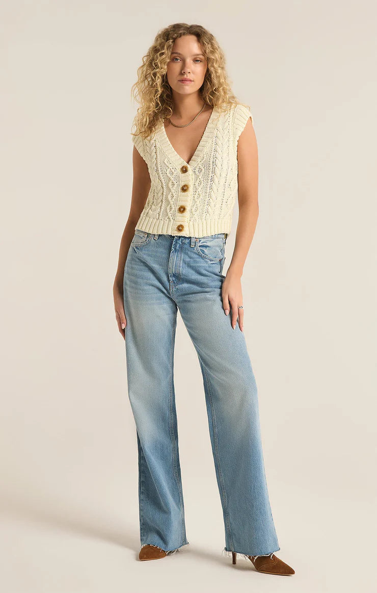 We're loving this all-season cable knit cropped sweater vest. With its cap sleeves, wooden button front and v neckline, this top will instantly elevate your casual look.